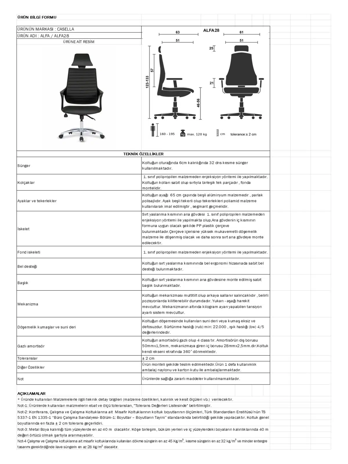 | Mekanizma | Amortisörlü yükseklik Ve sırt eğimi ayarı |
