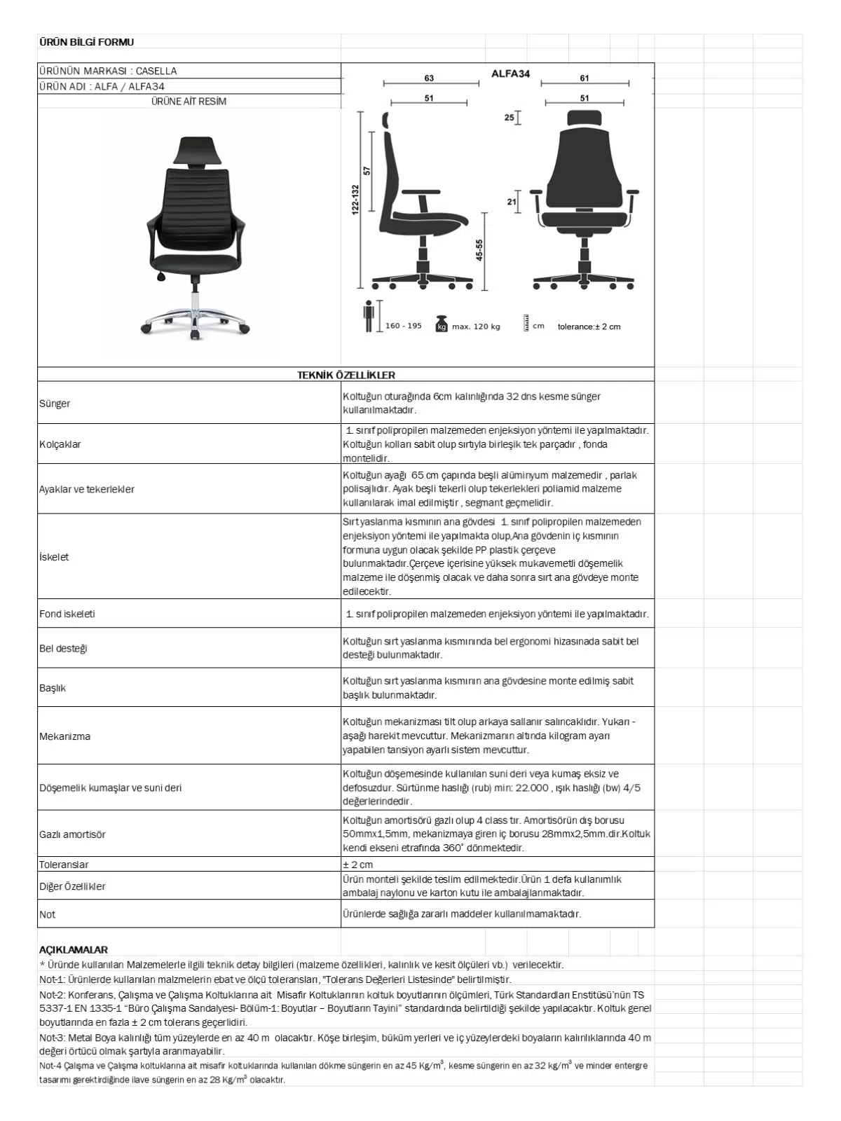 | Mekanizma | Amortisörlü yükseklik Ve sırt eğimi ayarı |