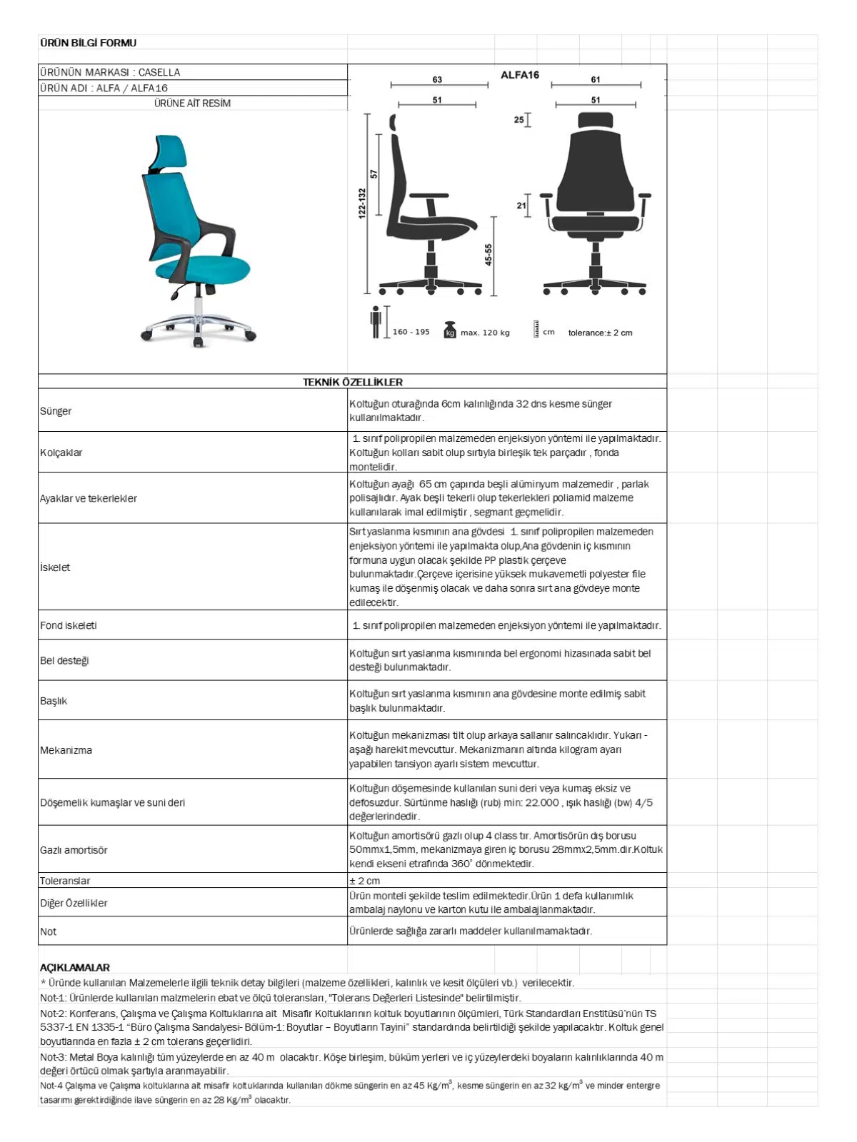 | Mekanizma | Amortisörlü yükseklik Ve sırt eğimi ayarı |