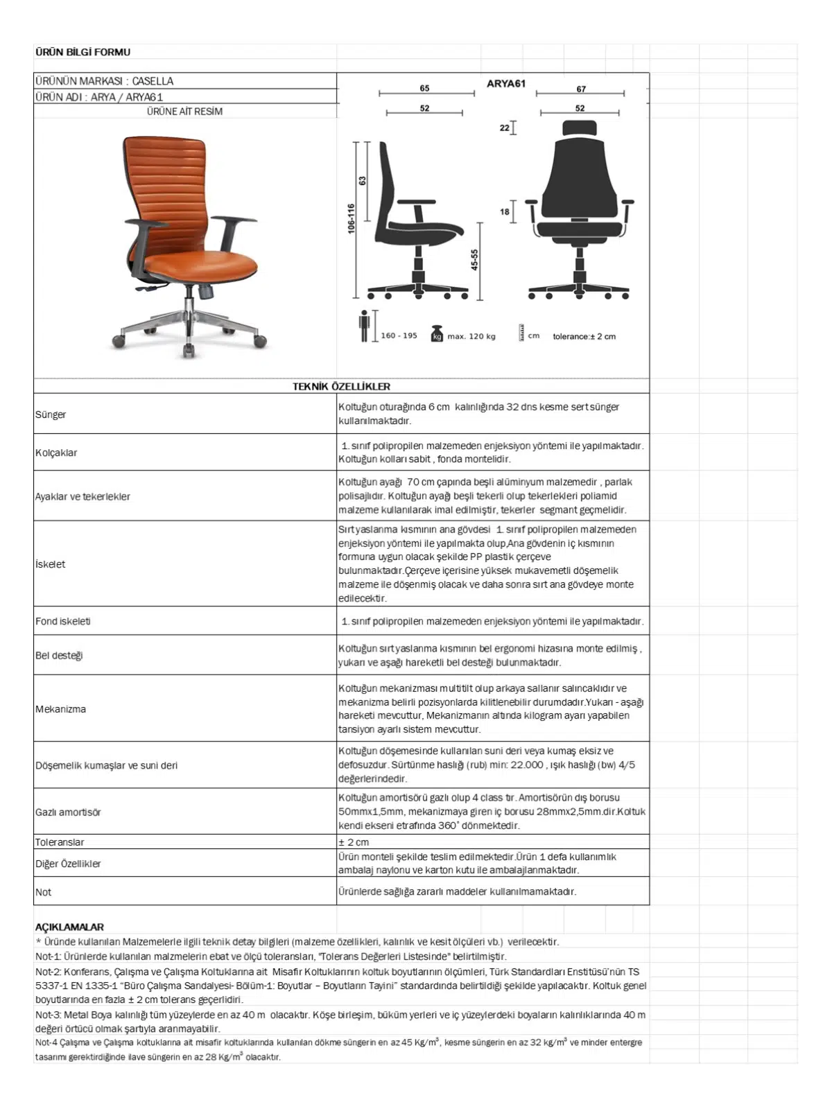 | Mekanizma | Amortisörlü yükseklik Ve sırt eğimi ayarı |