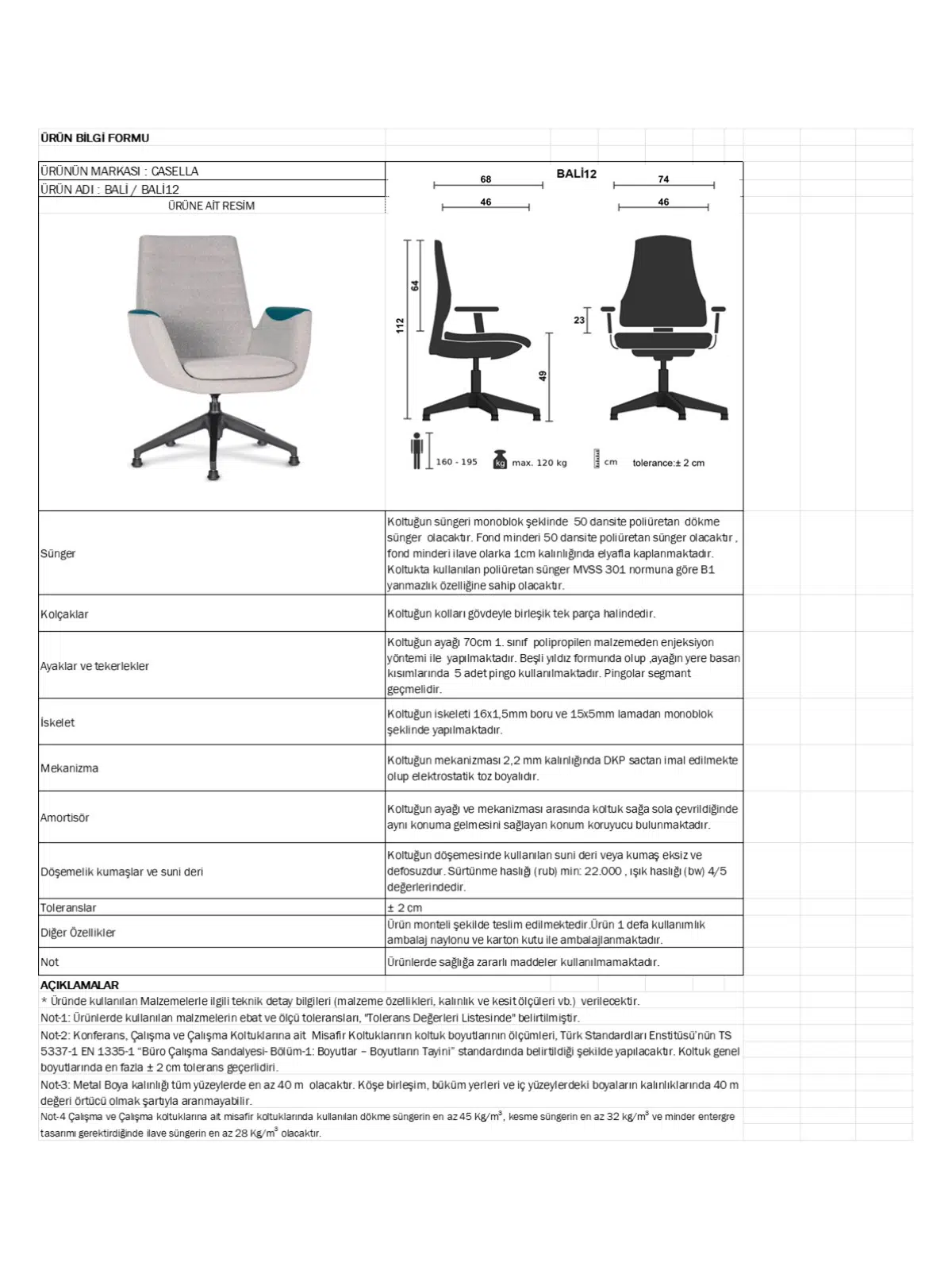 | Mekanizma | Amortisörlü yükseklik Ve sırt eğimi ayarı |