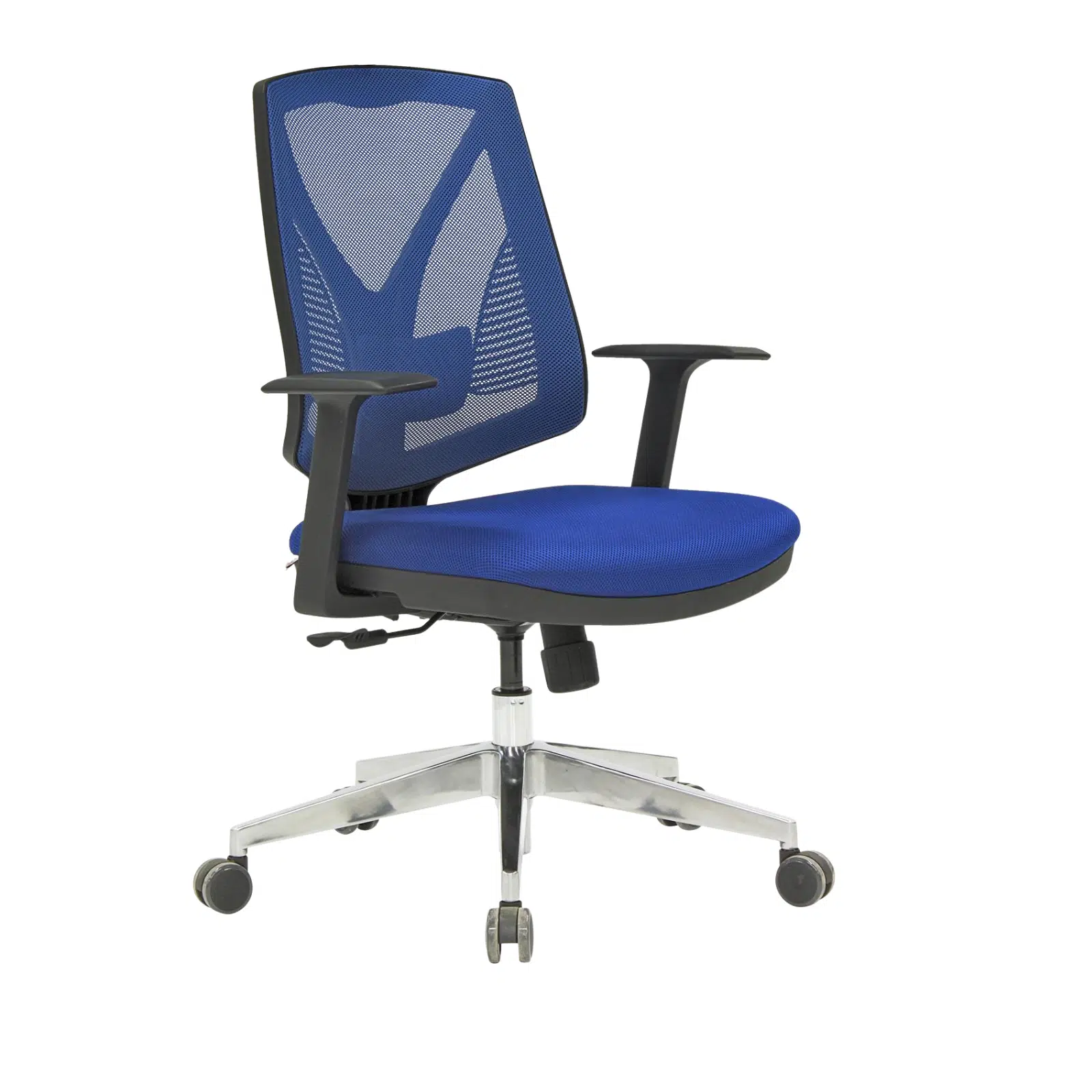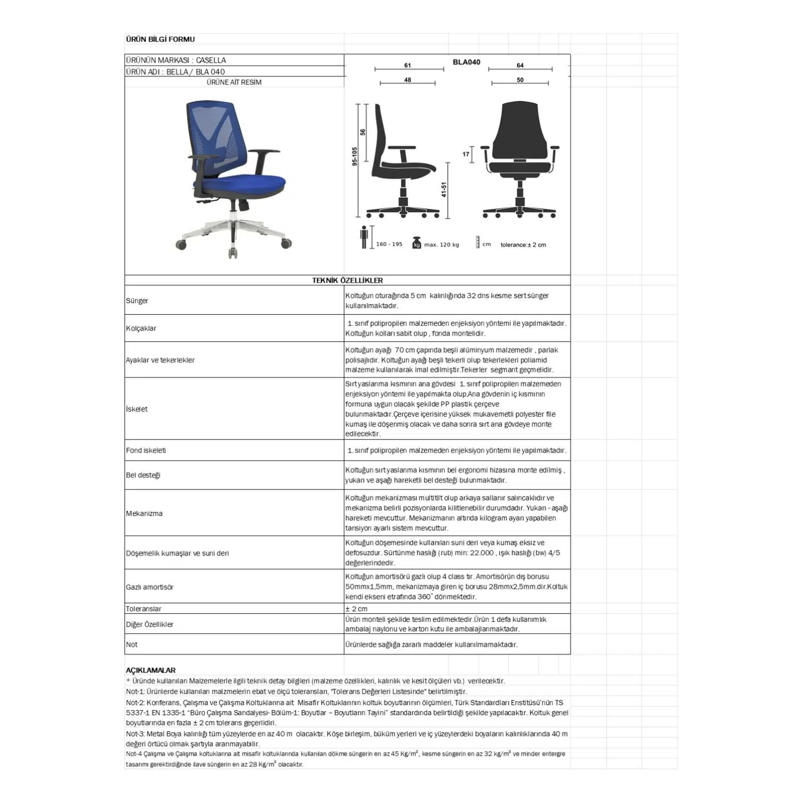 Yüksek mukavemetli alüminyum ayak yapısı uzun ömürlü kullanım sağlarken, sabit kolçaklar dengeli ve rahat bir oturma pozisyonu oluşturur. Entegre bel desteği omurganın doğal eğrisini koruyarak uzun süreli çalışmalarda oluşabilecek bel ve sırt ağrılarını azaltmaya yardımcı olur.