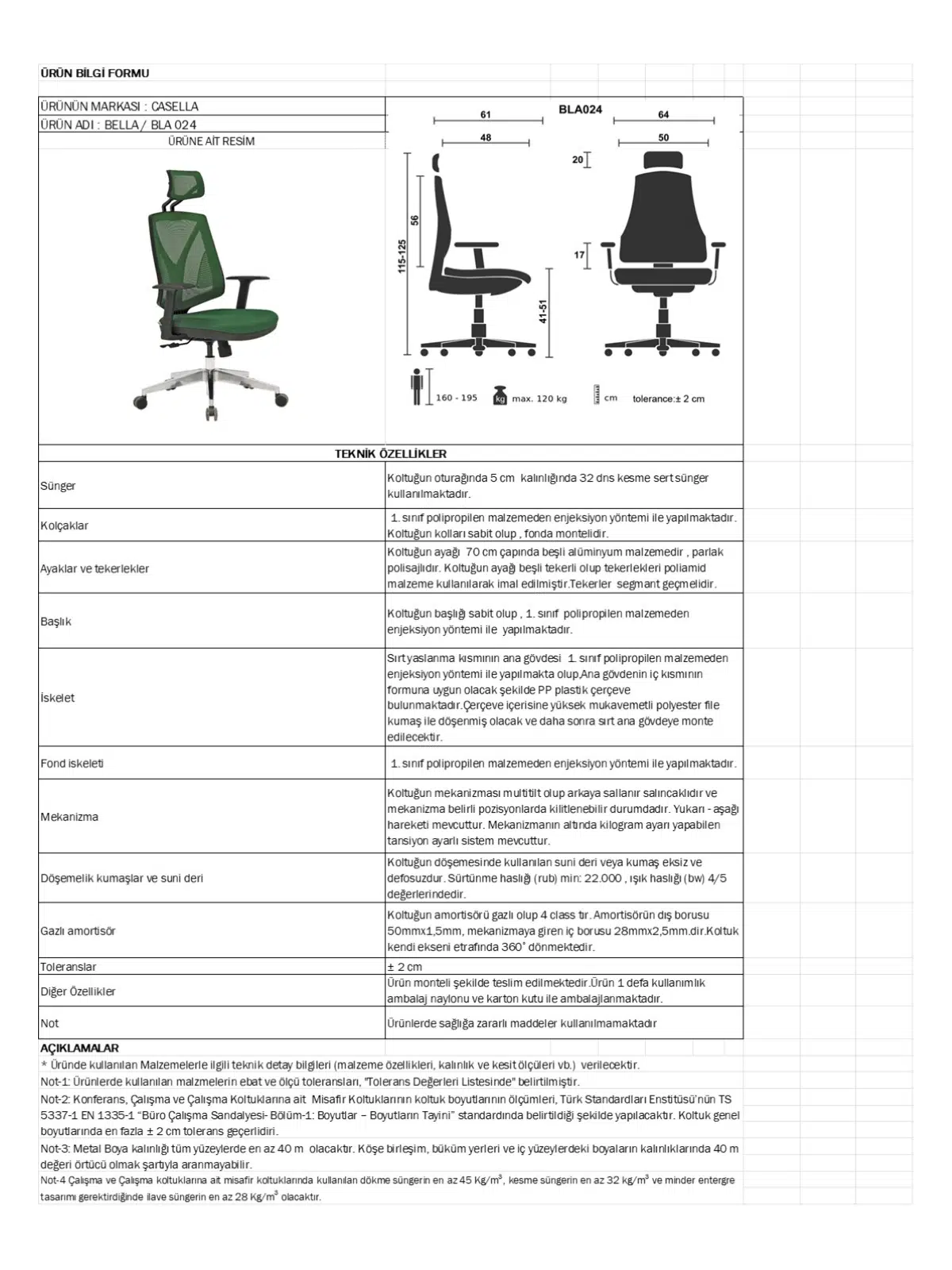 | Mekanizma | Amortisörlü yükseklik Ve sırt eğimi ayarı |