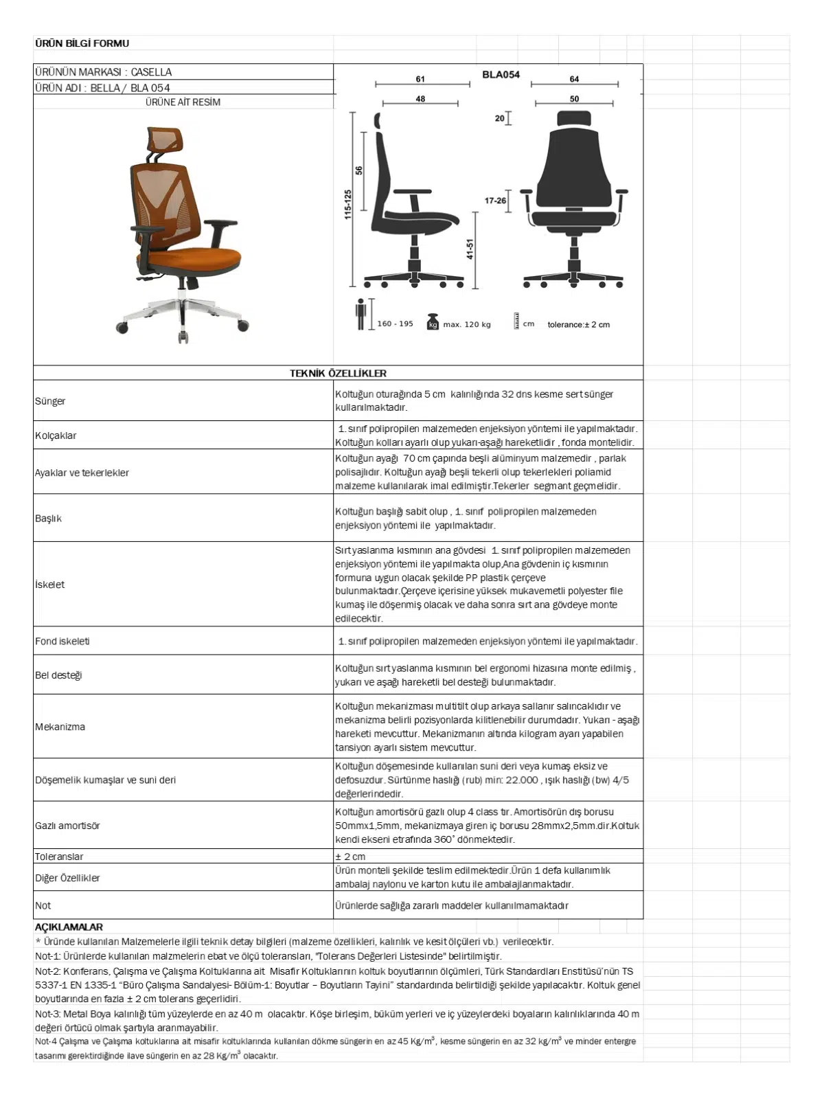 | Mekanizma | Amortisörlü yükseklik Ve sırt eğimi ayarı |