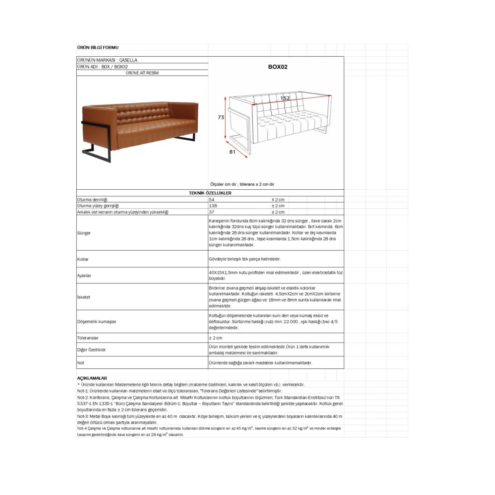 Boyalı metal ayaklar, sağlamlığı sayesinde yoğun kullanıma uygundur. Casella kanepe modelleri arasında sade tasarımı, dayanıklılığı ve fiyat–performans avantajıyla öne çıkan bu model; ofisler, bekleme alanları, lobi alanları, yönetici odaları, klinikler ve showroomlar için ideal bir tercihtir.