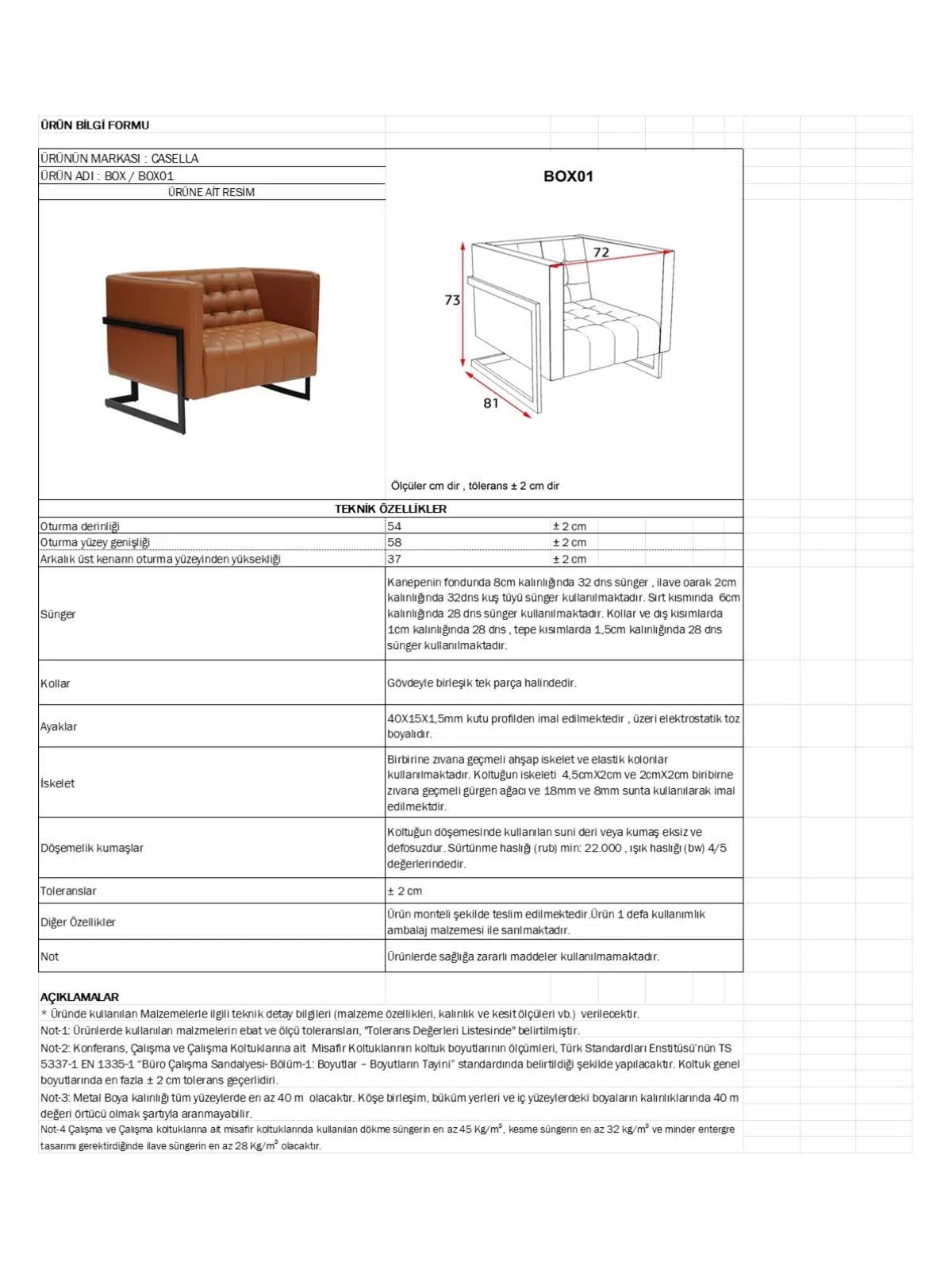 Casella Box Tekli Ofis Kanepesi (BOX 01), lobi ve bekleme alanları, resepsiyonlar ve yönetici misafir köşeleri için tasarlanmış modern bir tekli ofis kanepesi / berjerdir. Yüksek yoğunluklu sünger, sağlam iskelet ve kolay temizlenebilir döşeme ile uzun oturumlarda konfor sunar; minimal çizgileriyle mekâna prestijli ve profesyonel bir görünüm katar.