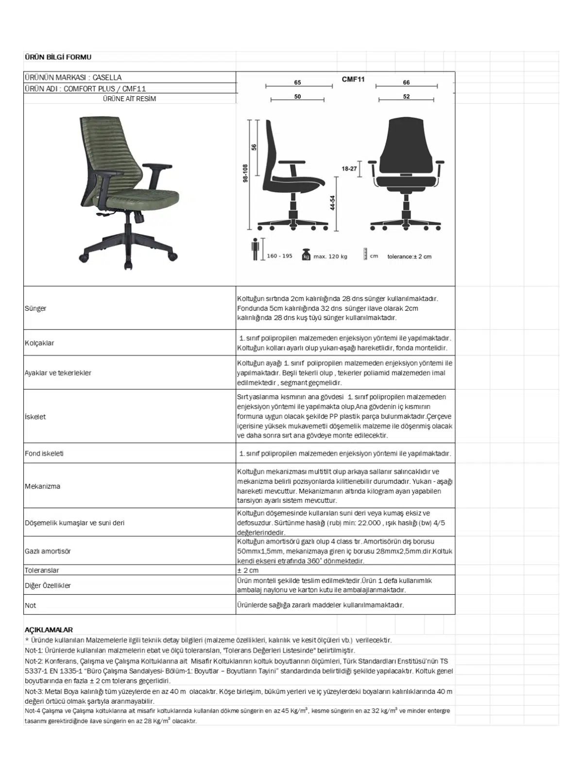 | Mekanizma | Amortisörlü yükseklik Ve sırt eğimi ayarı |