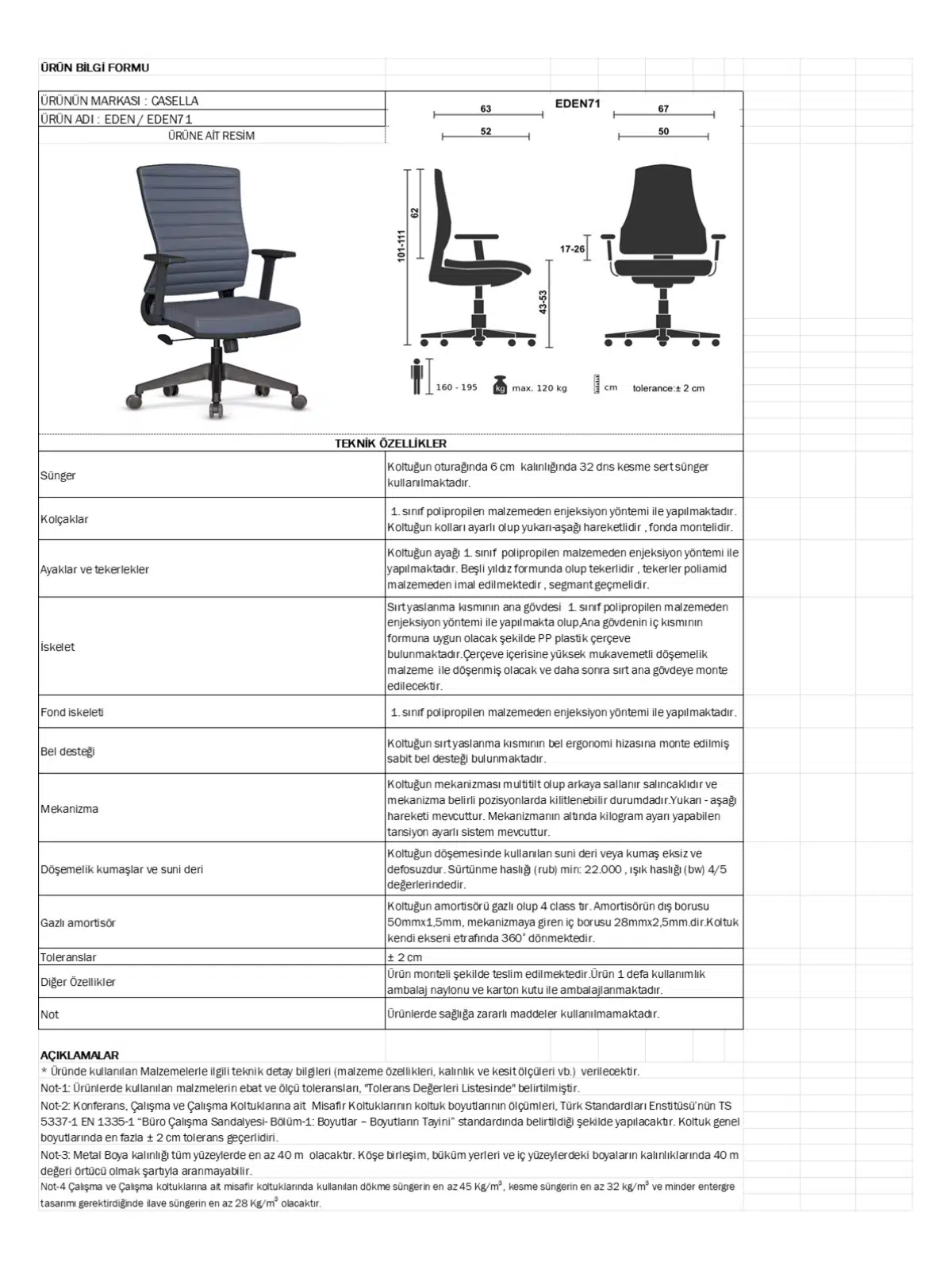| Mekanizma | Amortisörlü yükseklik Ve sırt eğimi ayarı |