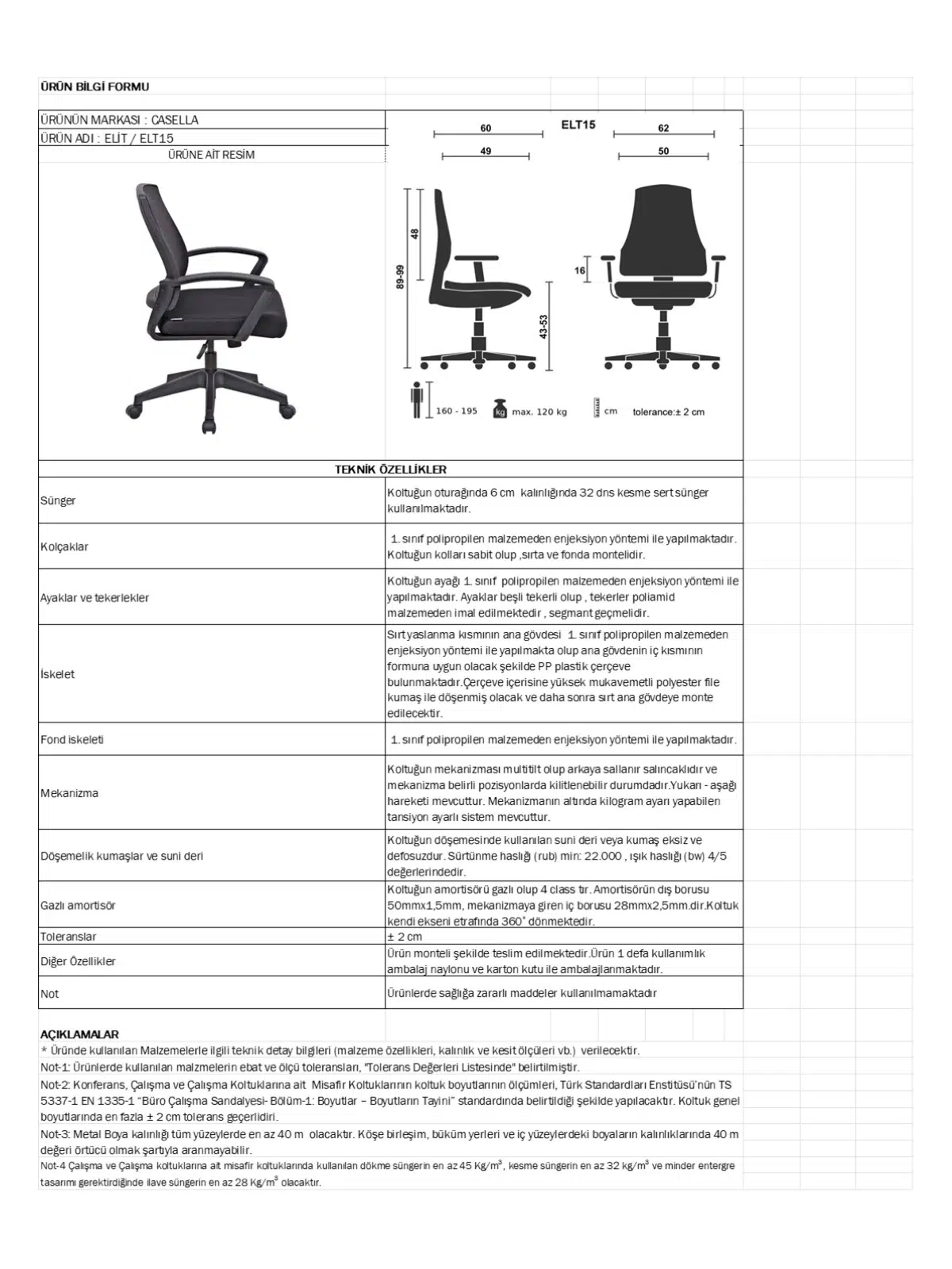 | Mekanizma | Amortisörlü yükseklik Ve sırt eğimi ayarı |