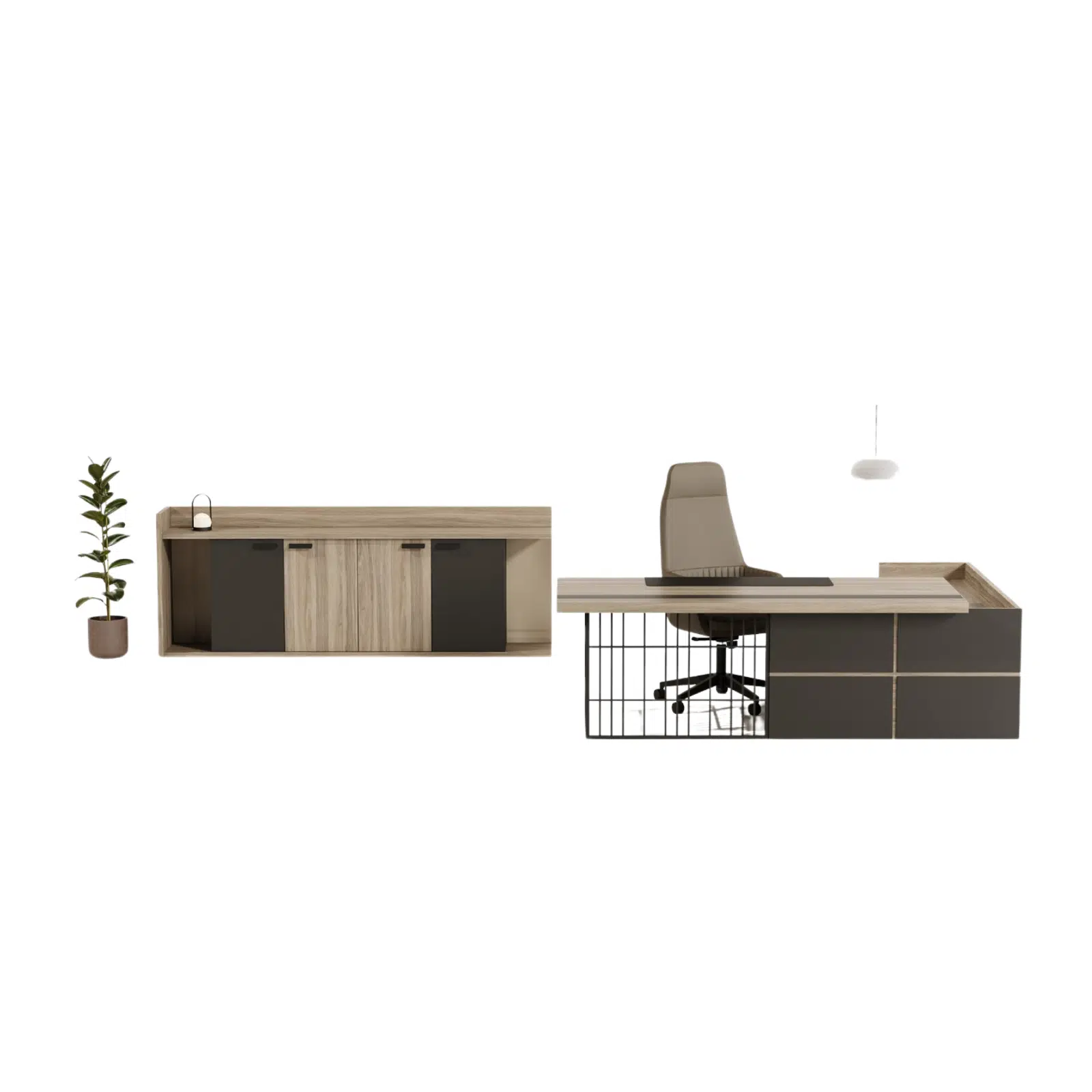 Geniş çalışma alanına sahip yönetici masası, ergonomik kullanım sunarken; tamamlayıcı dolap ve depolama modülleri sayesinde ofis düzenini kolaylaştırır. Fonksiyonel tasarımı sayesinde hem estetik hem de kullanışlı bir yönetici ofisi oluşturmak isteyenler için ideal bir tercihtir.