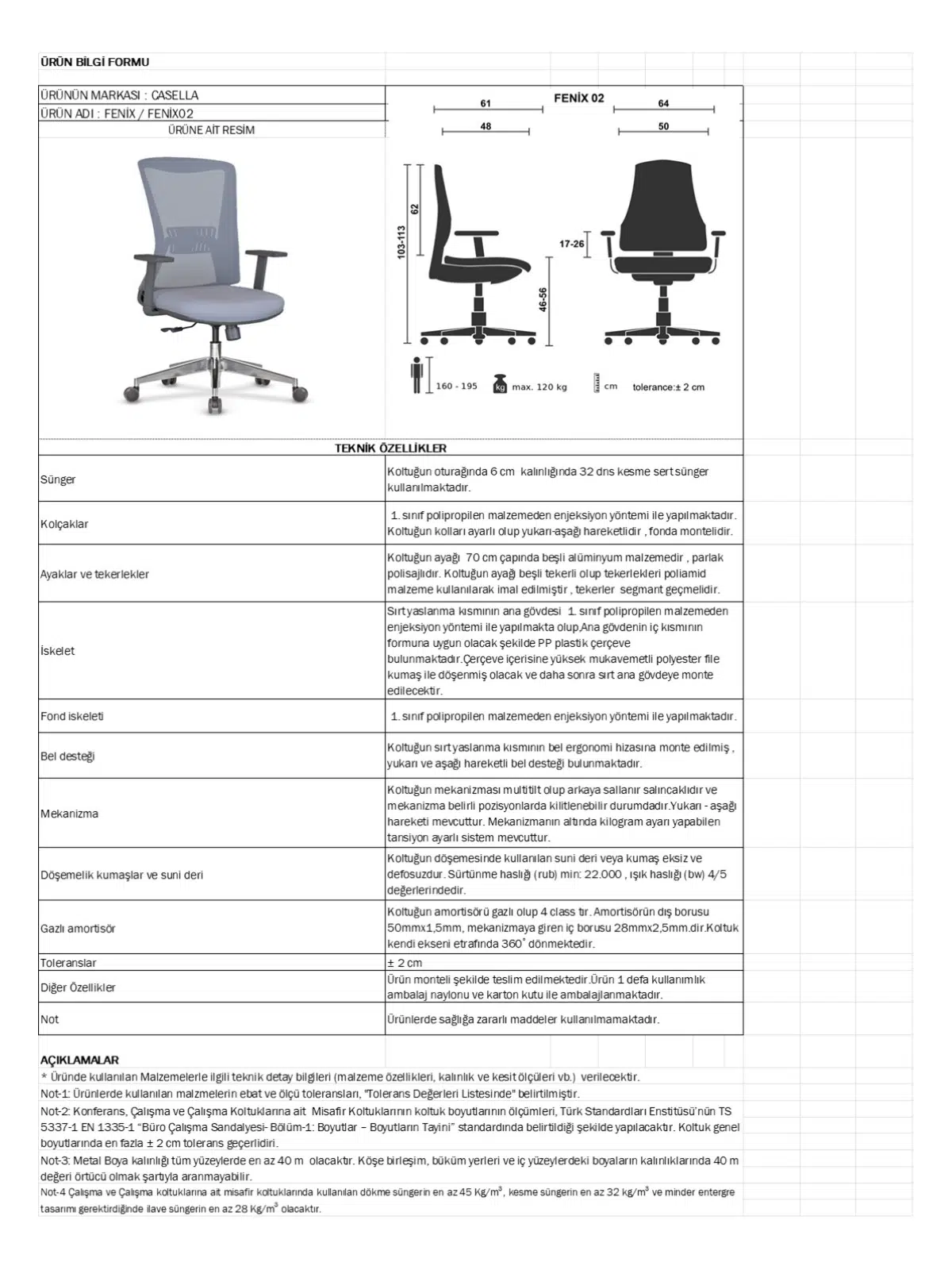 | Mekanizma | Amortisörlü yükseklik Ve sırt eğimi ayarı |