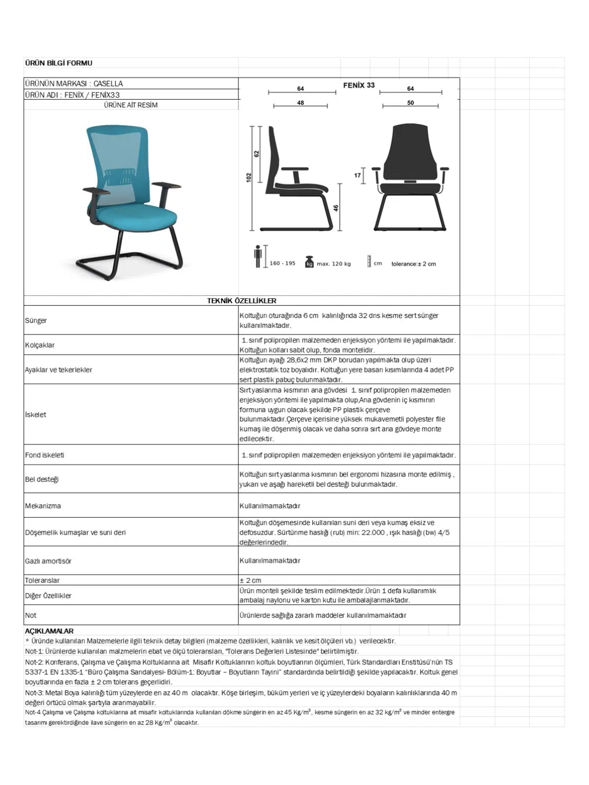 | Mekanizma | Amortisörlü yükseklik Ve sırt eğimi ayarı |