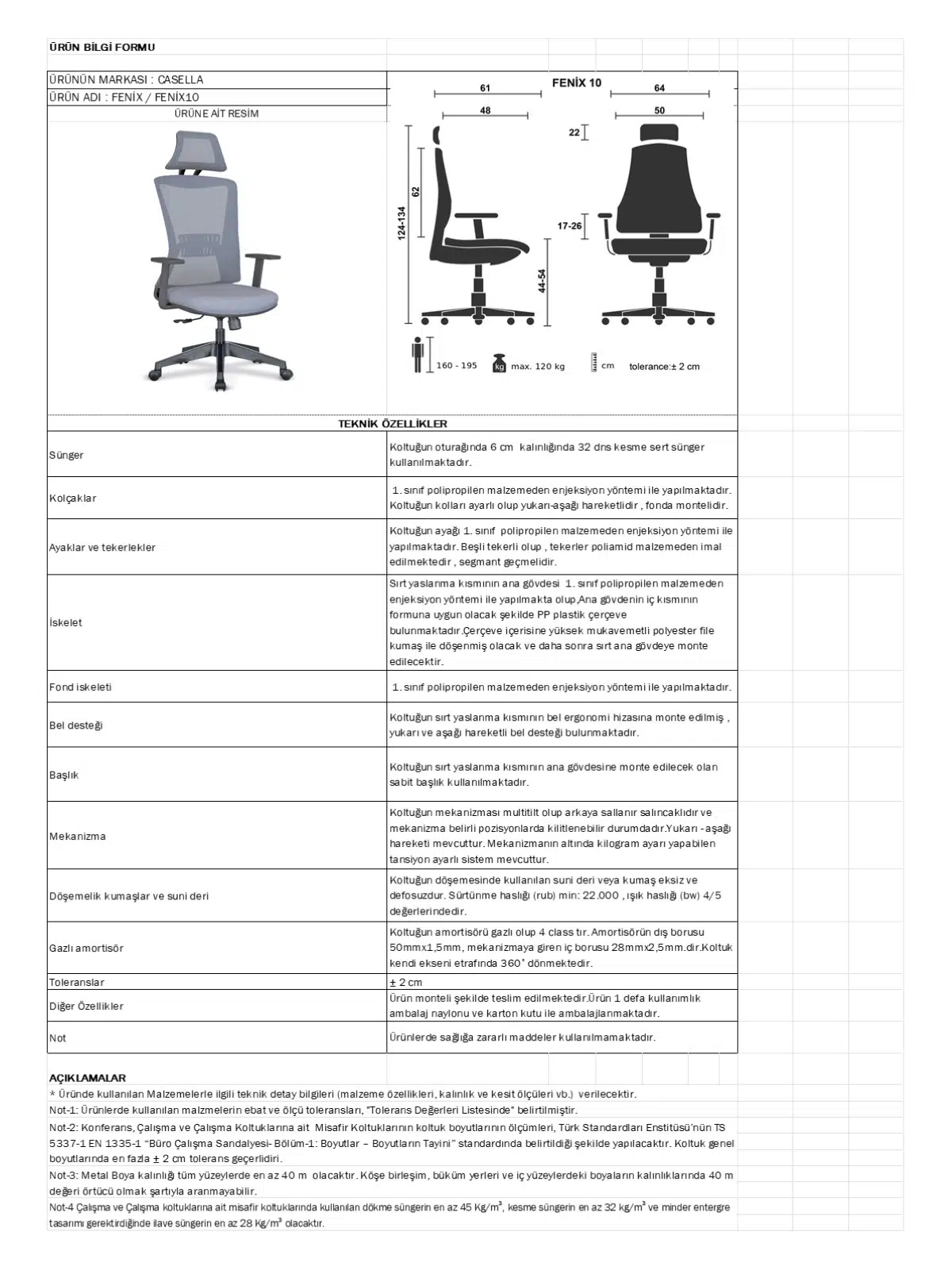 | Mekanizma | Amortisörlü yükseklik Ve sırt eğimi ayarı |