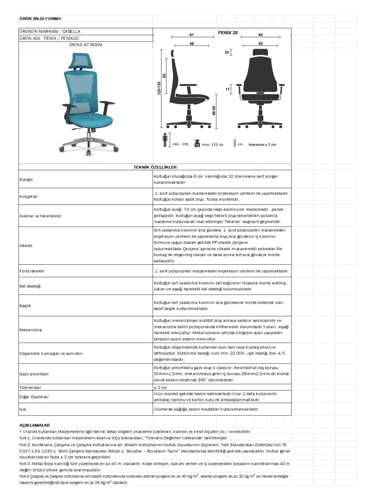 | Mekanizma | Amortisörlü yükseklik Ve sırt eğimi ayarı |