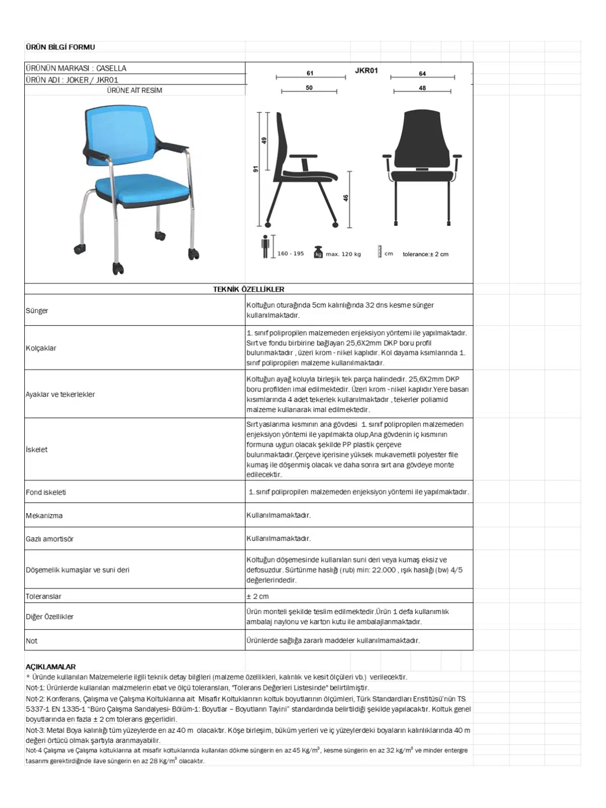 | Mekanizma | Amortisörlü yükseklik Ve sırt eğimi ayarı |