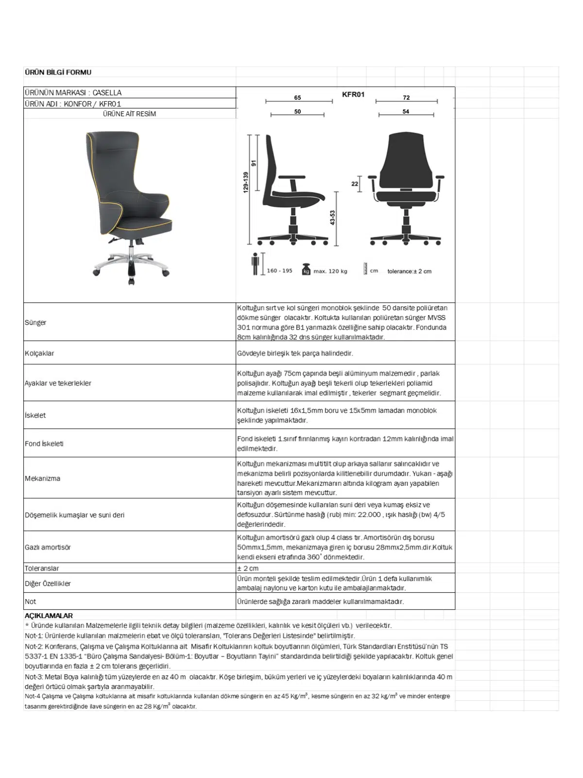 Casella Konfor Yönetici Koltuğu (KFR 01), yönetici ofisleri ve üst düzey çalışma alanları için tasarlanmış modern bir yönetici koltuğudur. Ergonomik sırt formu, ayarlanabilir mekanizma ve kaliteli döşemesiyle uzun çalışma saatlerinde konfor sunar; zarif çizgileriyle mekâna prestij ve profesyonel bir görünüm katar.