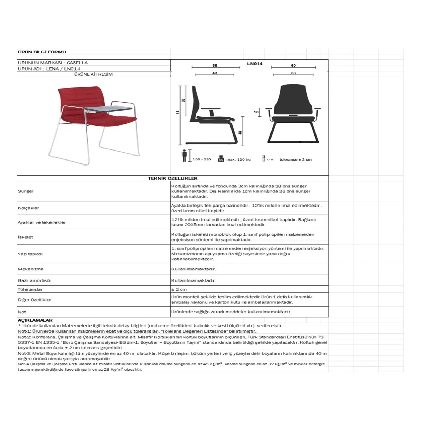 Koltuğa entegre edilen yazı tablası, özellikle eğitim, sunum ve seminerlerde kullanıcıya büyük kolaylık sağlar. Ergonomik konumlandırılmış tabla, not alma ve belge kullanımı için yeterli alan sunarken koltuğun dengeli yapısını korur. Kullanılmadığı durumlarda pratik bir şekilde hareket ettirilebilir yapıdadır.
