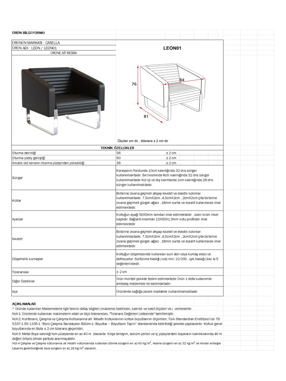 Casella Leon Tekli Ofis Kanepesi (LEON 01), lobi ve bekleme alanları, resepsiyonlar ve yönetici misafir köşeleri için tasarlanmış modern bir tekli ofis kanepesi / berjerdir. Yüksek yoğunluklu sünger, sağlam iskelet ve kolay temizlenebilir döşeme ile uzun oturumlarda konfor sunar; minimal çizgileriyle mekâna prestijli ve profesyonel bir görünüm katar.