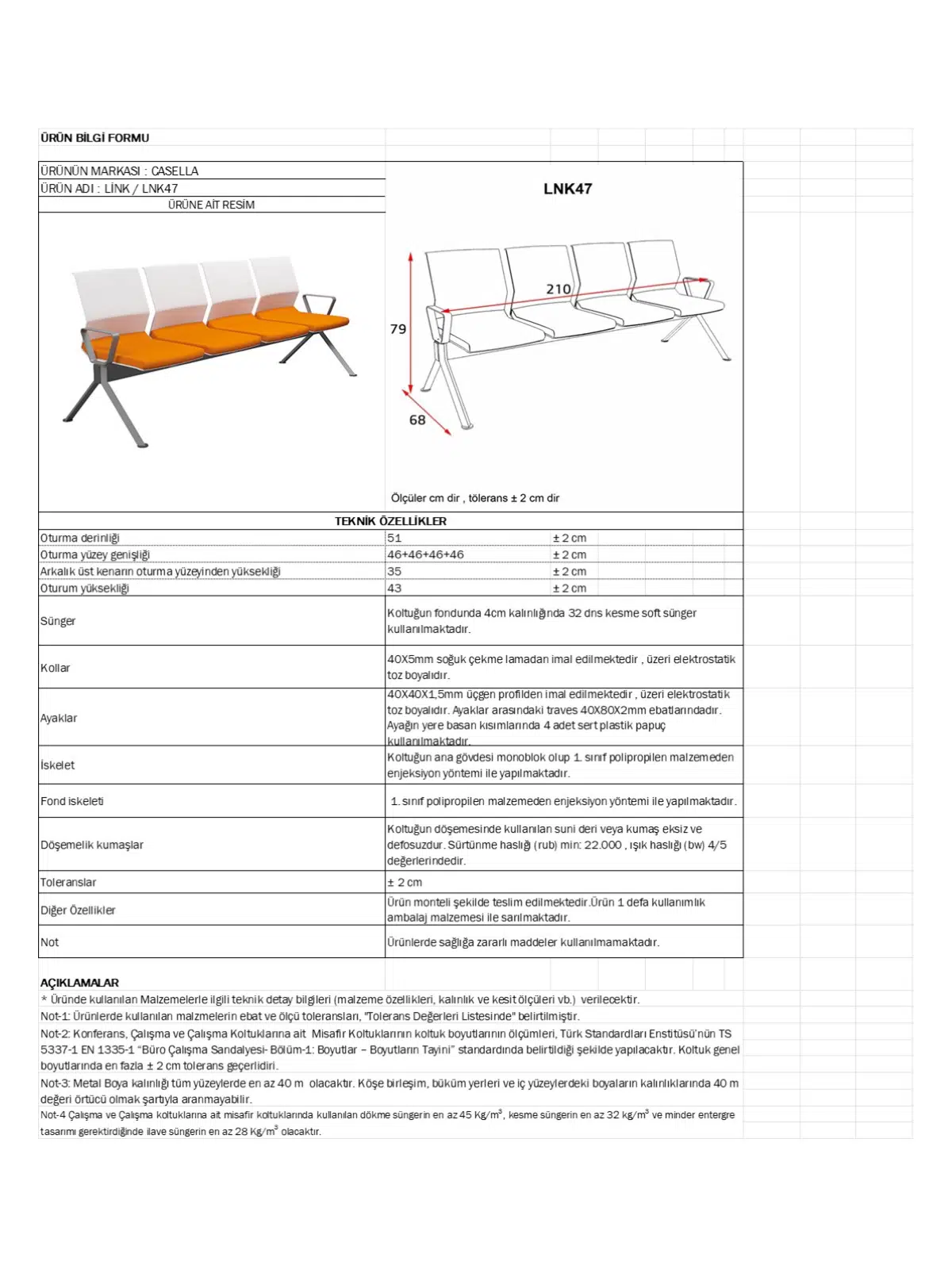 Casella Link Bekleme Koltuğu (LNK 47), banko önleri, hastane & klinikler, kamu kurumları, okul ve kurumsal lobilerde uzun ömürlü kullanım için tasarlanmış modern bir bekleme koltuğu / sıra bankıdır. Sağlam metal gövde, kolay temizlenebilir oturum–sırt yüzeyleri ve modüler yapısıyla yoğun kullanıma uygun, dayanıklı ve şık bir çözüm sunar.
