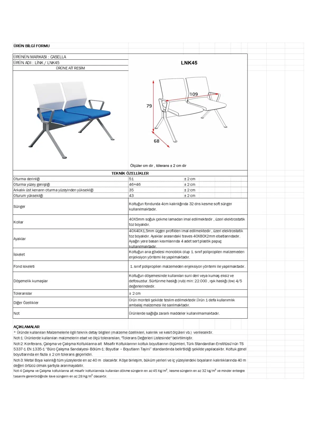 Casella Link Bekleme Koltuğu (LNK 45), banko önleri, hastane & klinikler, kamu kurumları, okul ve kurumsal lobilerde uzun ömürlü kullanım için tasarlanmış modern bir bekleme koltuğu / sıra bankıdır. Sağlam metal gövde, kolay temizlenebilir oturum–sırt yüzeyleri ve modüler yapısıyla yoğun kullanıma uygun, dayanıklı ve şık bir çözüm sunar.