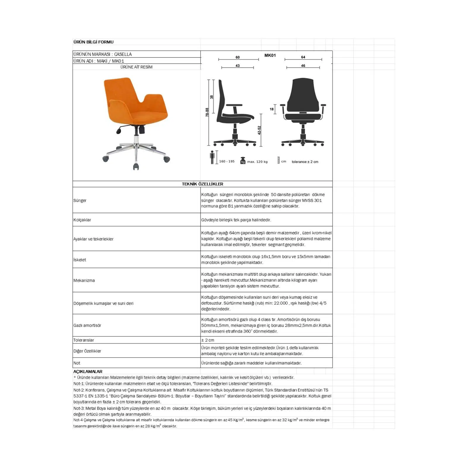 Mekanizma: Tilt mekanizma (geriye yatma özellikli)