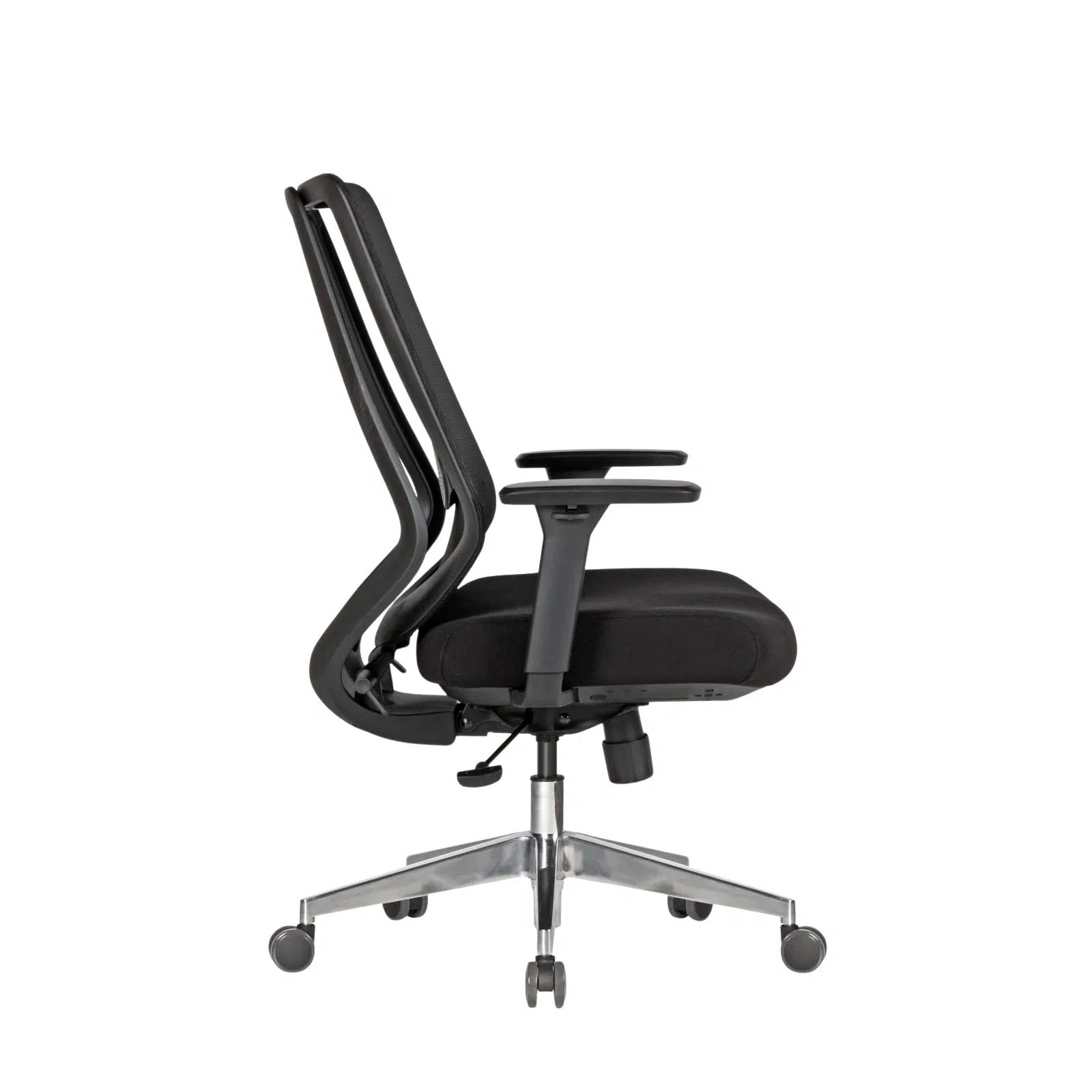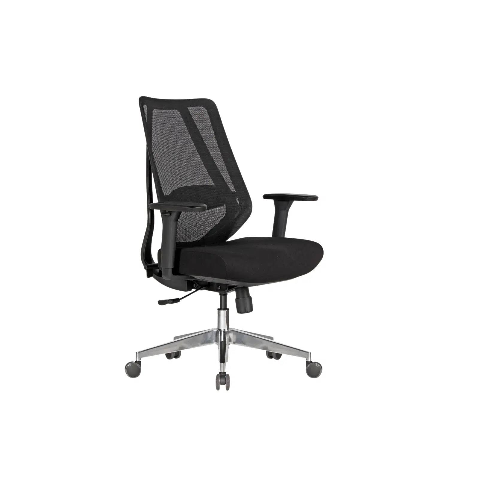 Siyah renkli plastik gövdesi ofislere profesyonel ve sade bir görünüm kazandırırken, ayarlanabilir kolçaklar kol ve omuz bölgesindeki yükü azaltarak kişiye özel konfor sağlar. Dayanıklı alüminyum ayak yapısı ise yüksek stabilite ve uzun ömürlü kullanım avantajı sunar.