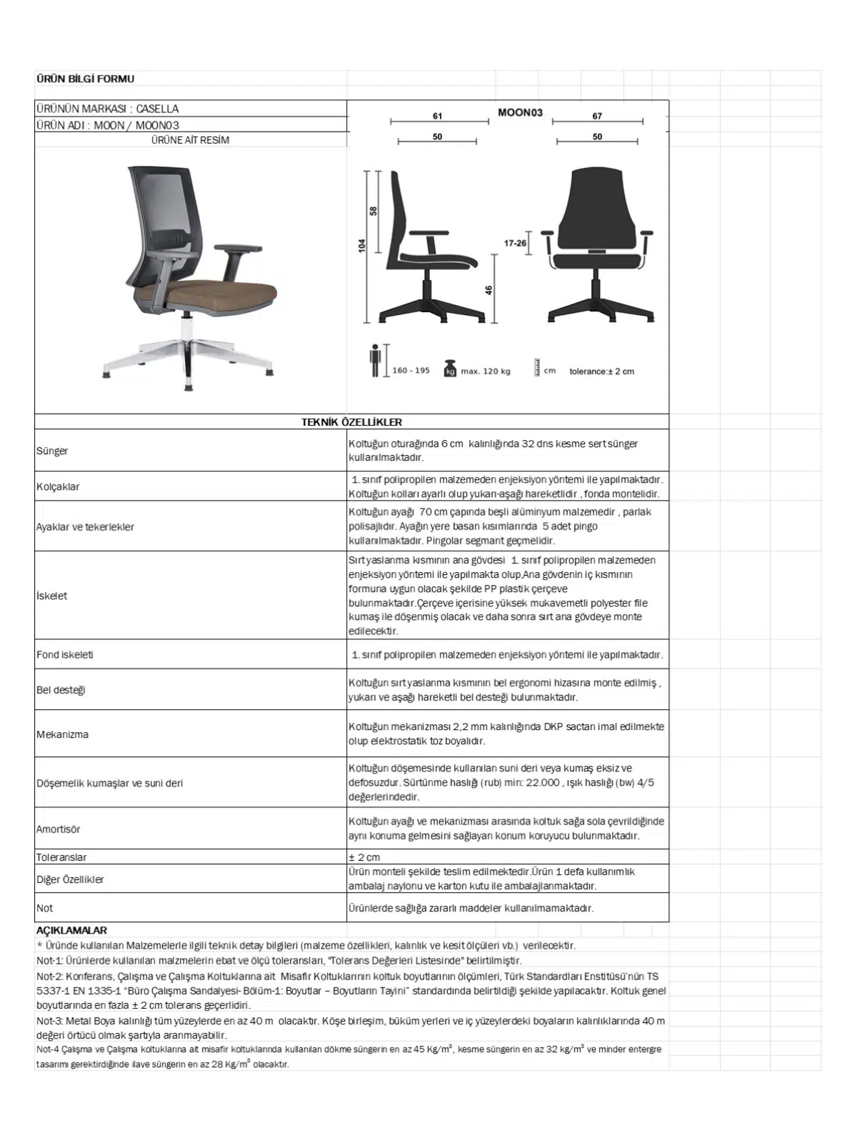 | Mekanizma | Amortisörlü yükseklik Ve sırt eğimi ayarı |