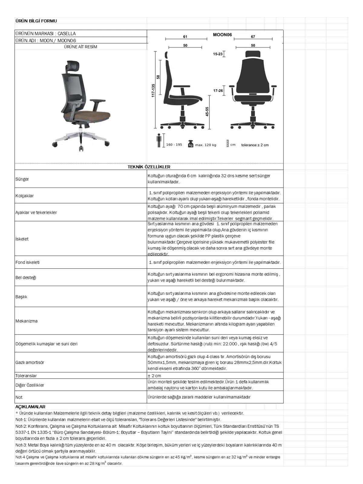 | Mekanizma | Amortisörlü yükseklik Ve sırt eğimi ayarı |