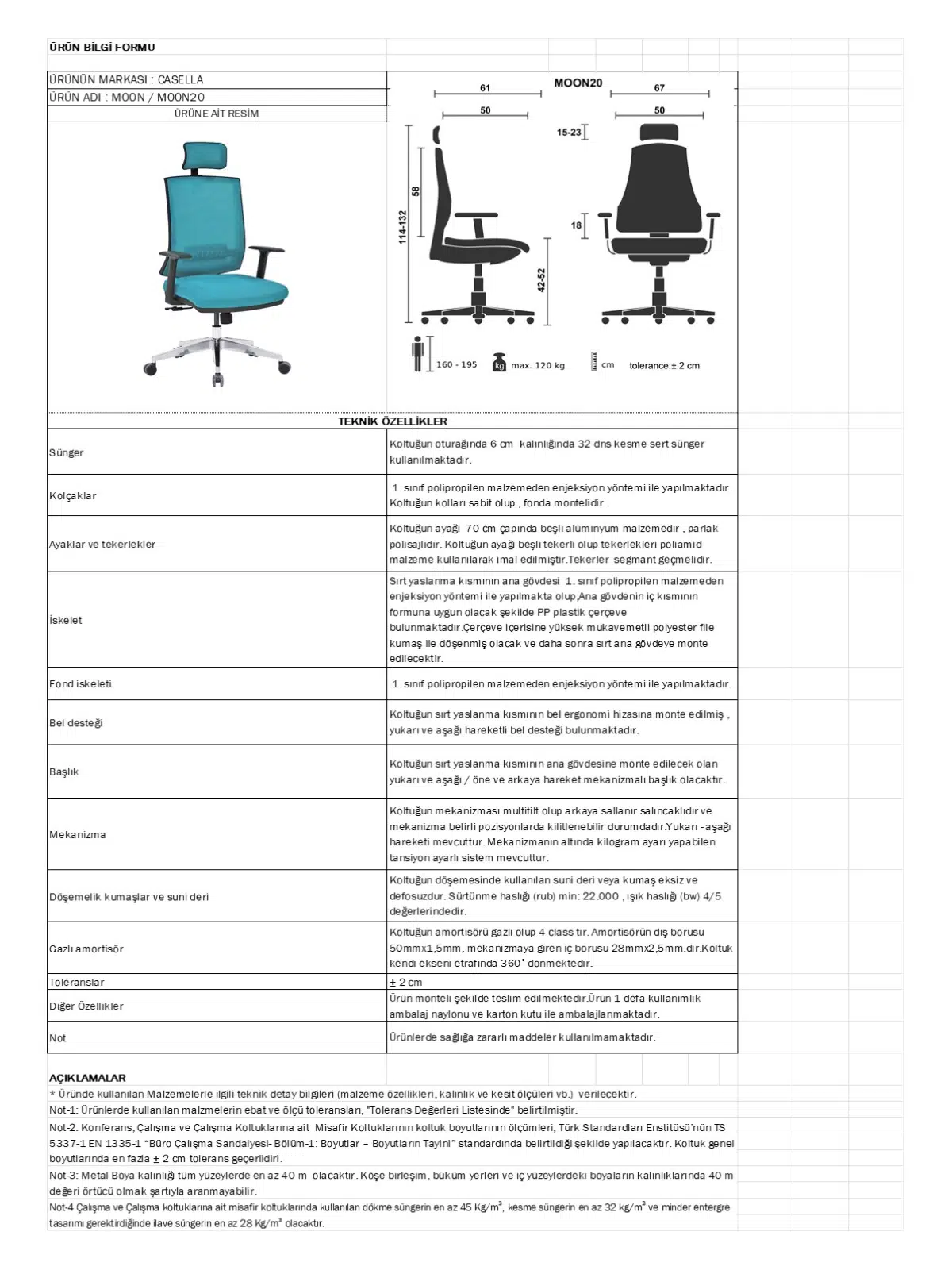 | Mekanizma | Amortisörlü yükseklik Ve sırt eğimi ayarı |