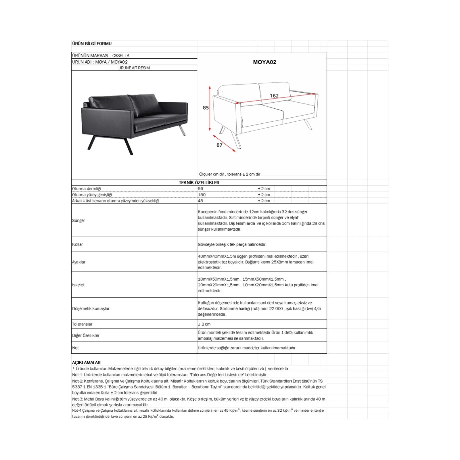 Boyalı metal ayaklar, sağlamlığı sayesinde yoğun kullanıma uygundur. Casella kanepe modelleri arasında sade tasarımı, dayanıklılığı ve fiyat–performans avantajıyla öne çıkan bu model; ofisler, bekleme alanları, lobi alanları, yönetici odaları, klinikler ve showroomlar için ideal bir tercihtir.