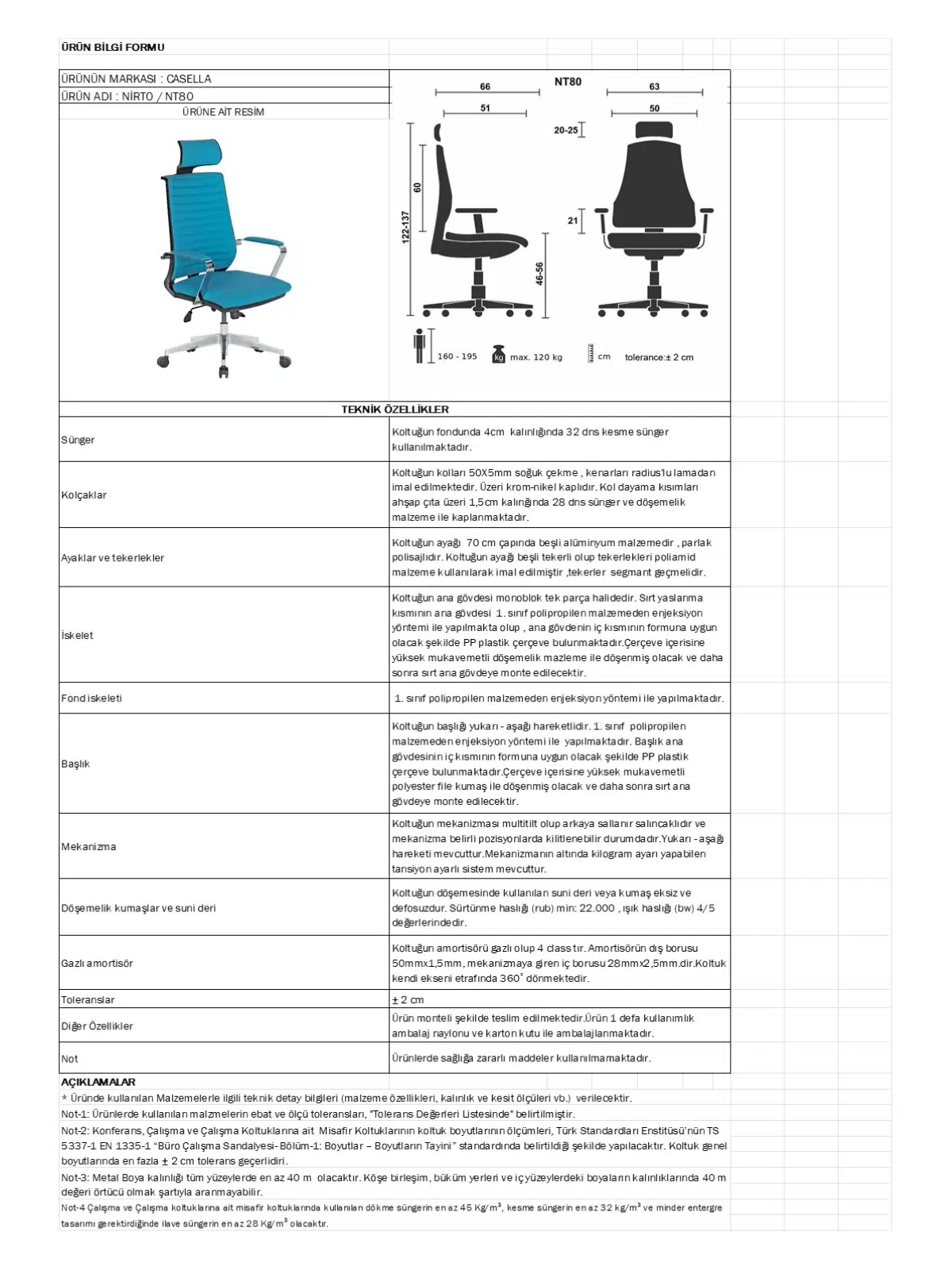 | Mekanizma | Amortisörlü yükseklik Ve sırt eğimi ayarı |