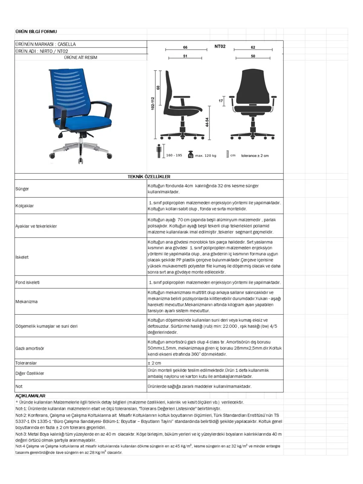 | Mekanizma | Amortisörlü yükseklik Ve sırt eğimi ayarı |
