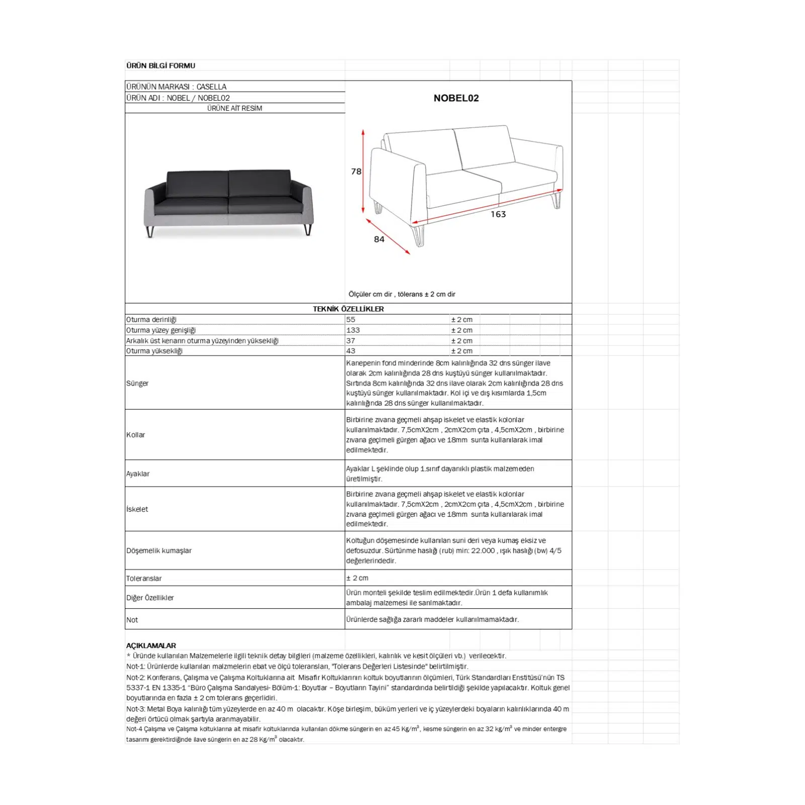 Boyalı metal ayaklar, sağlamlığı sayesinde yoğun kullanıma uygundur. Casella kanepe modelleri arasında sade tasarımı, dayanıklılığı ve fiyat–performans avantajıyla öne çıkan bu model; ofisler, bekleme alanları, lobi alanları, yönetici odaları, klinikler ve showroomlar için ideal bir tercihtir.