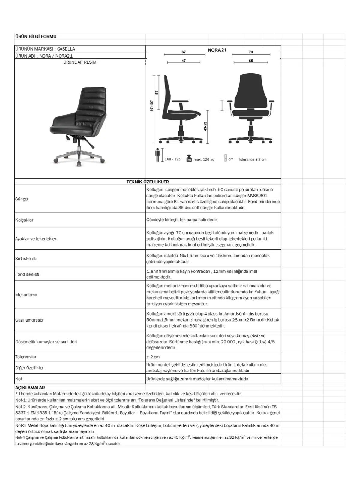| Mekanizma | Amortisörlü yükseklik Ve sırt eğimi ayarı |
