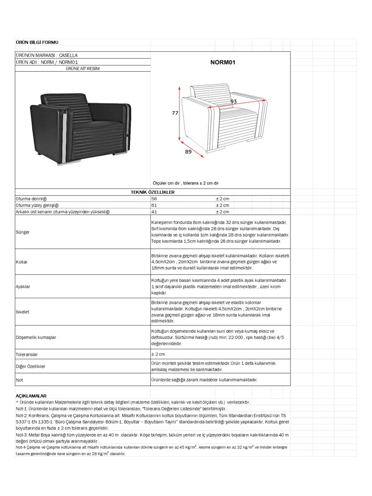 Casella Norm Tekli Ofis Kanepesi (NORM 01), lobi ve bekleme alanları, resepsiyonlar ve yönetici misafir köşeleri için tasarlanmış modern bir tekli ofis kanepesi / berjerdir. Yüksek yoğunluklu sünger, sağlam iskelet ve kolay temizlenebilir döşeme ile uzun oturumlarda konfor sunar; minimal çizgileriyle mekâna prestijli ve profesyonel bir görünüm katar.