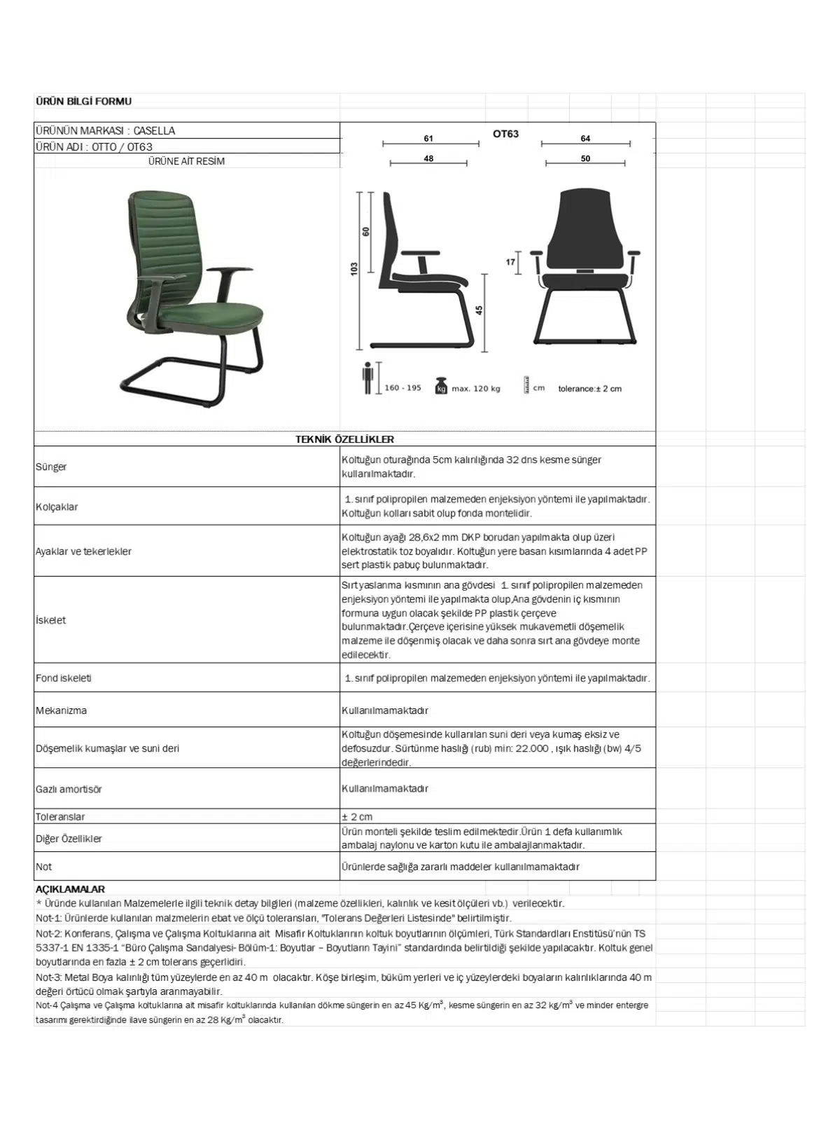| Mekanizma | Amortisörlü yükseklik Ve sırt eğimi ayarı |