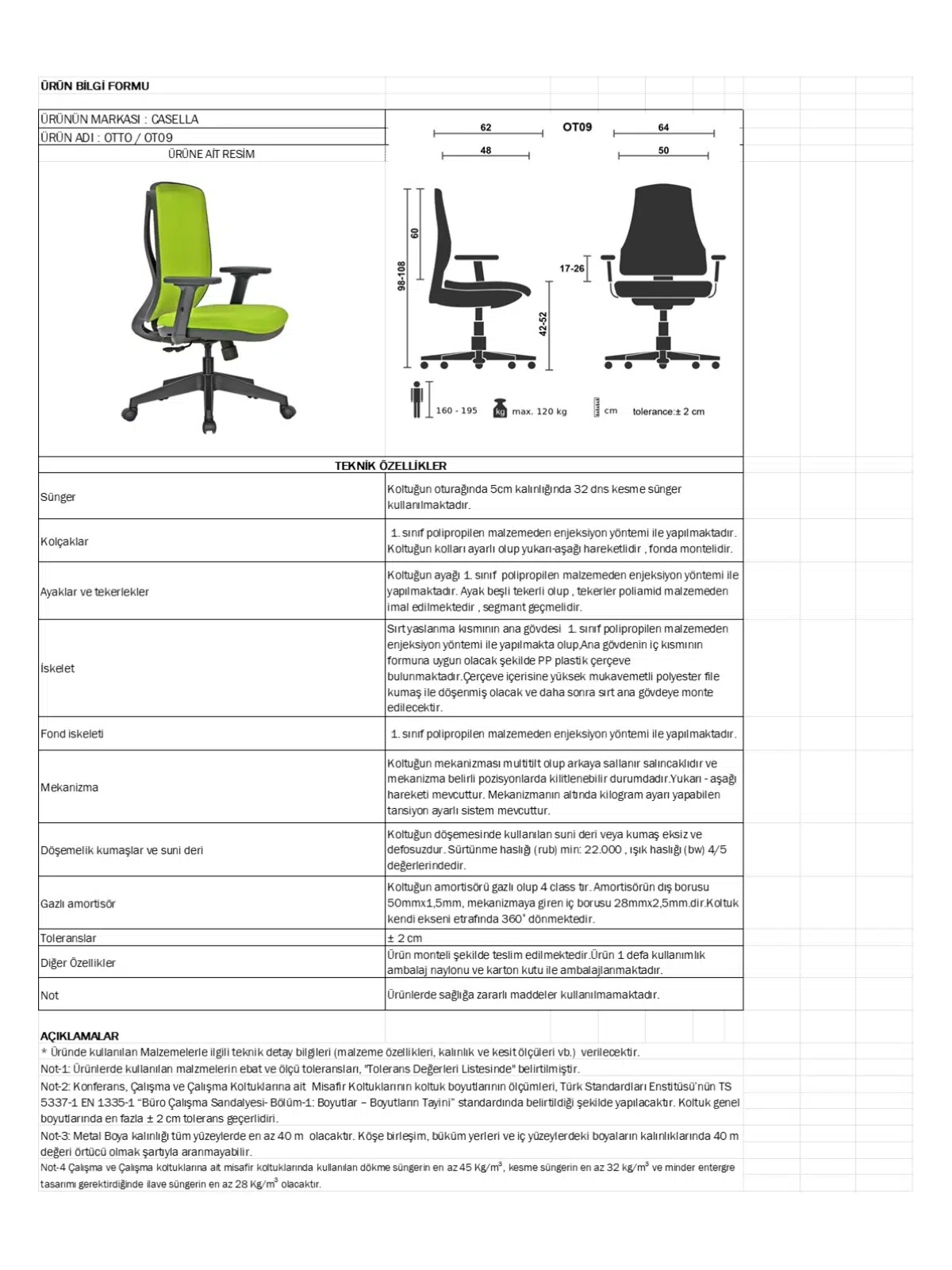 | Mekanizma | Amortisörlü yükseklik Ve sırt eğimi ayarı |