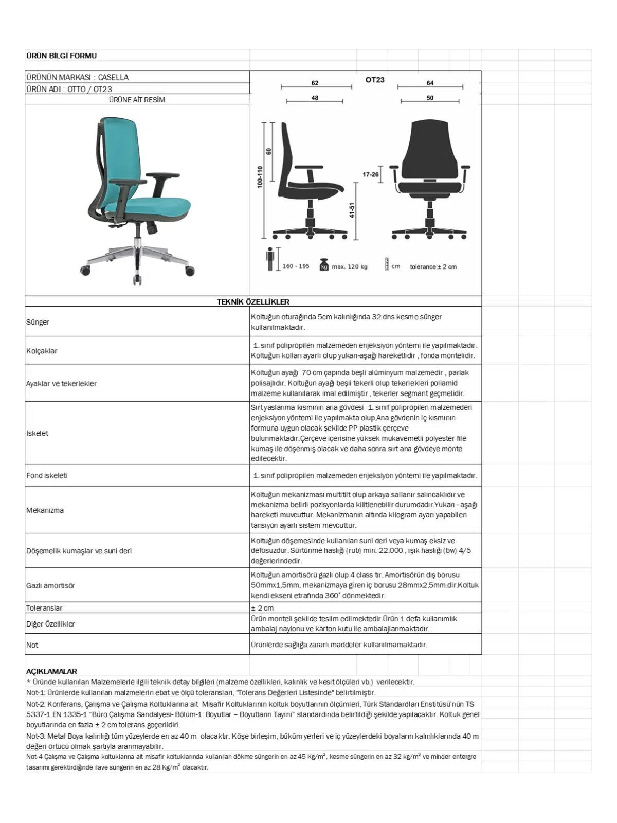 | Mekanizma | Amortisörlü yükseklik Ve sırt eğimi ayarı |