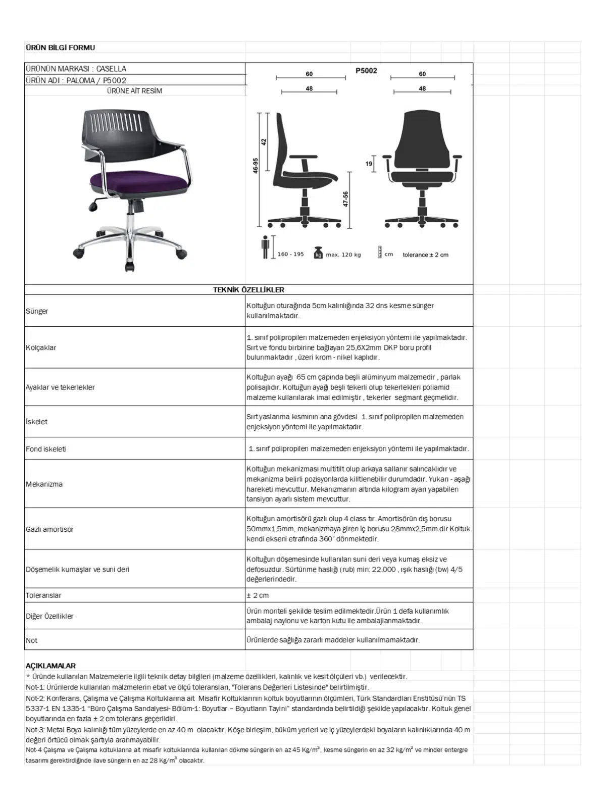 | Mekanizma | Amortisörlü yükseklik Ve sırt eğimi ayarı |