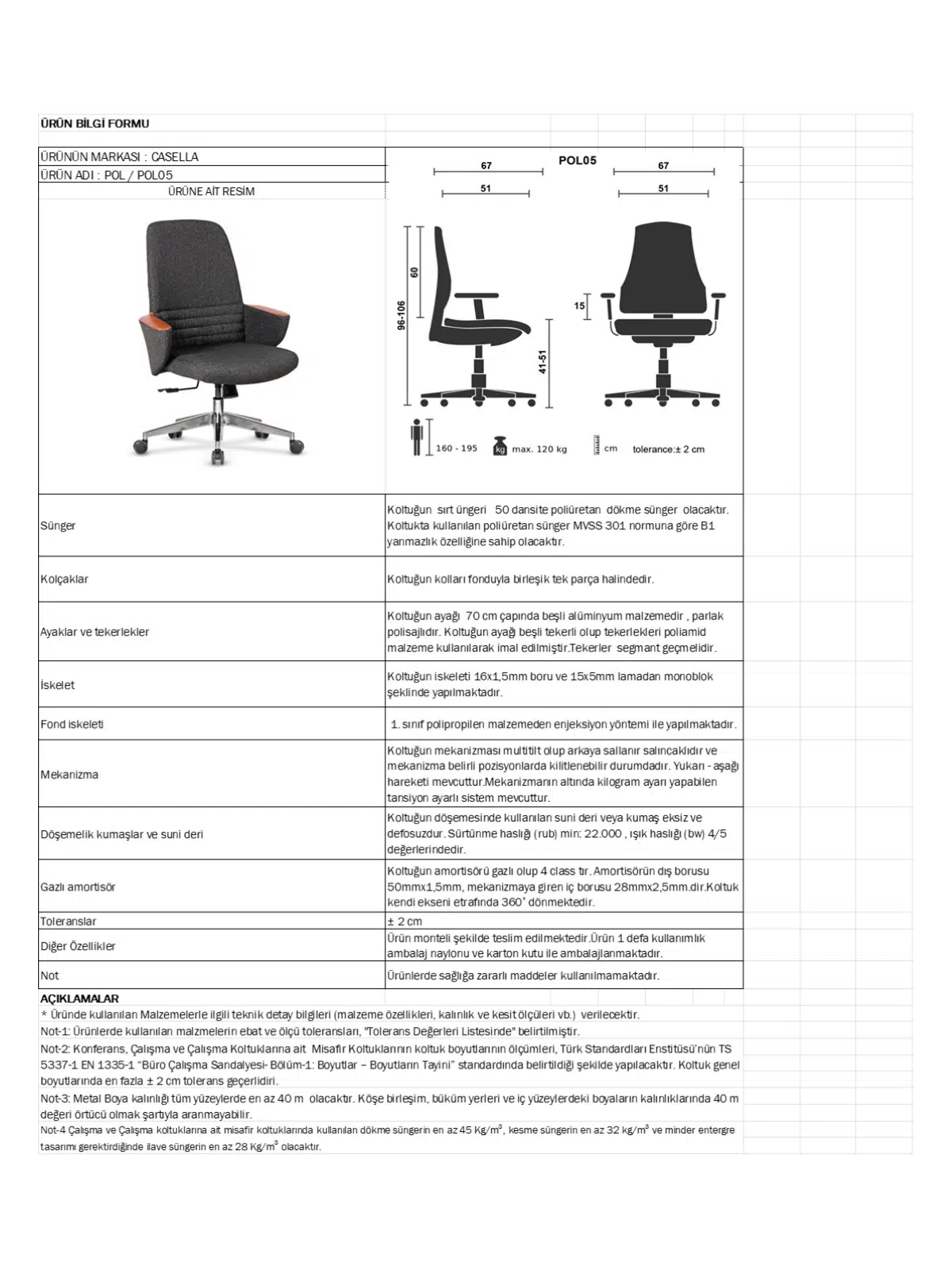 | Mekanizma | Amortisörlü yükseklik Ve sırt eğimi ayarı |