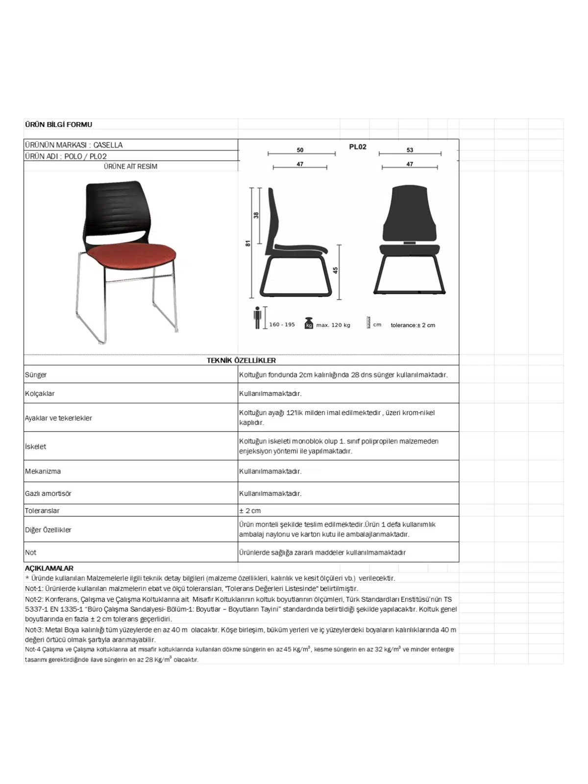| Kolçak | Konforlu, destekleyici; döşemeli üst yüzey |