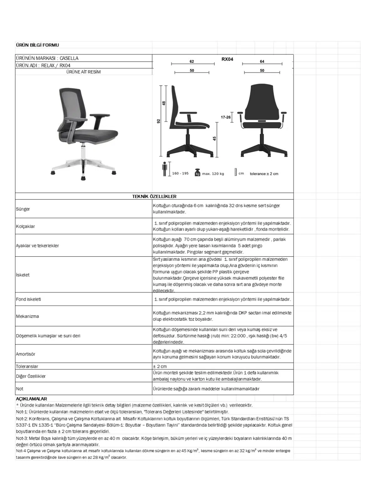 | Mekanizma | Amortisörlü yükseklik Ve sırt eğimi ayarı |