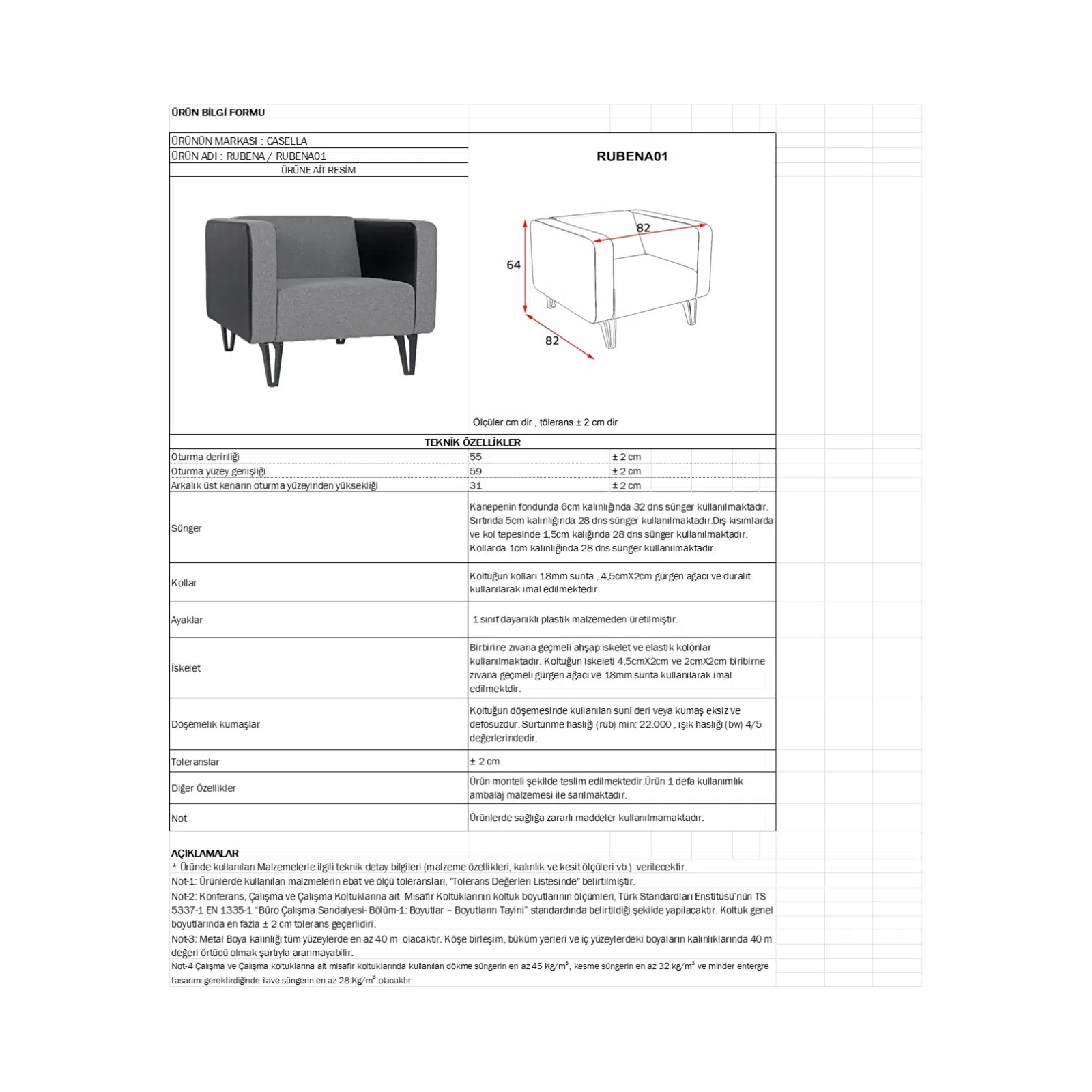 Tek kişilik oturum kapasitesi sayesinde dar alanlarda bile rahat bir kullanım sunar. Ergonomik sırt yapısı ve dengeli sünger yoğunluğu, uzun süreli oturumlarda dahi konforu korur ve çökme yapmadan formunu muhafaza eder. Oturum ve sırt bölümünde kullanılan yüksek yoğunluklu sünger yapısı, yumuşaklık ve destek dengesini ideal seviyede tutar.