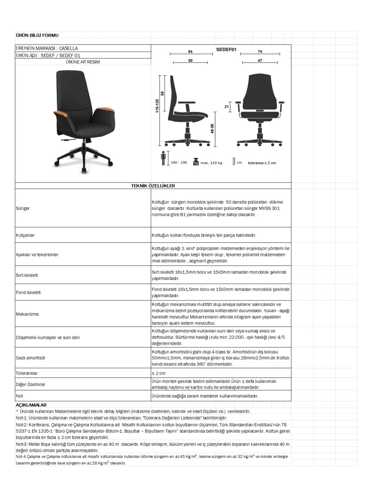 | Mekanizma | Amortisörlü yükseklik Ve sırt eğimi ayarı |