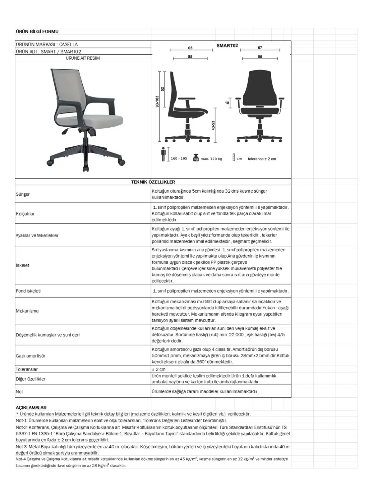 | Mekanizma | Amortisörlü yükseklik Ve sırt eğimi ayarı |