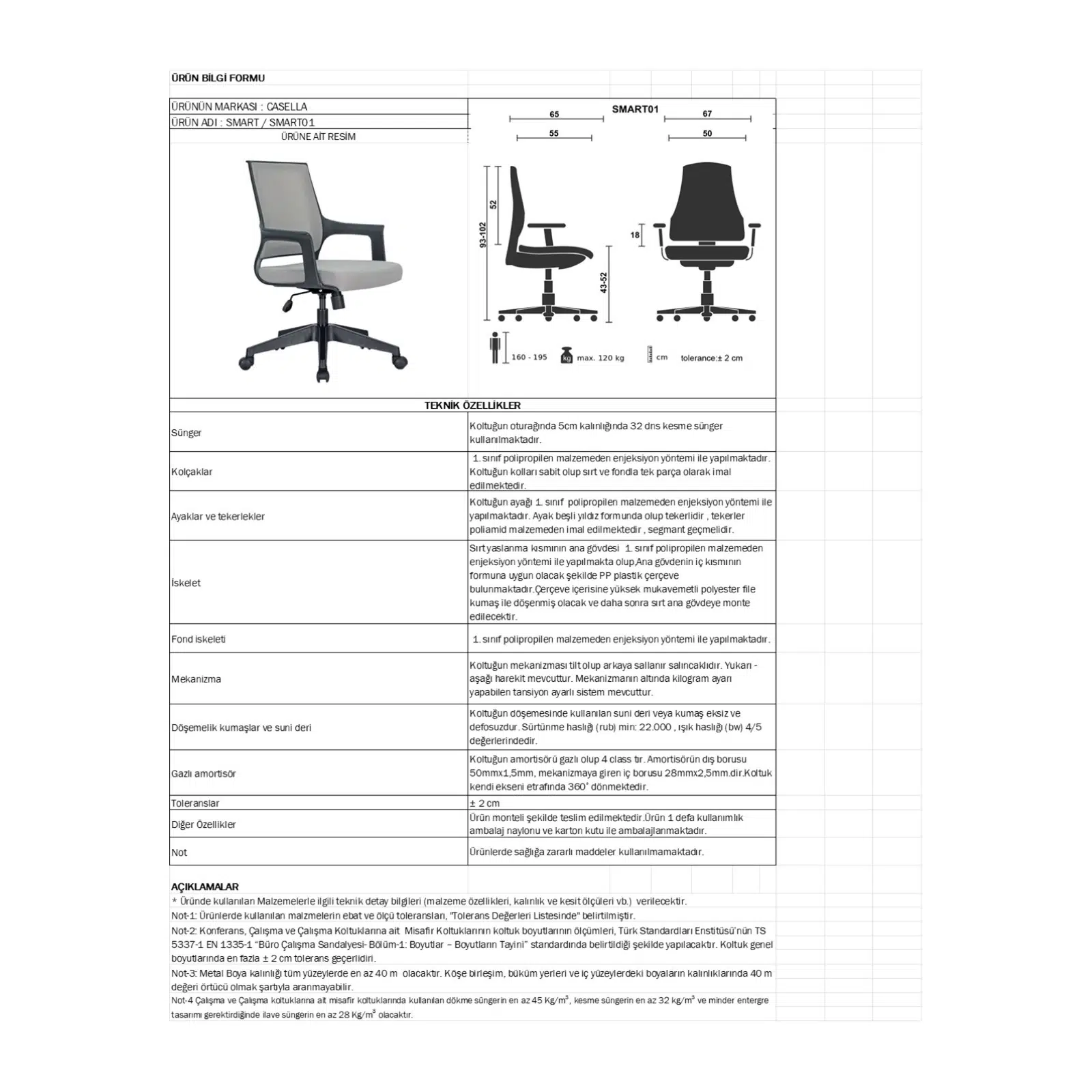 Hafif ve dayanıklı plastik yıldız ayak, ofis içinde kolay hareket imkânı sağlarken ürünün ekonomik ve fonksiyonel yapısını tamamlar. Smart serisi bu model; açık ofis alanları, çağrı merkezleri, bireysel çalışma alanları ve misafir kullanımına uygun pratik bir tercihtir.