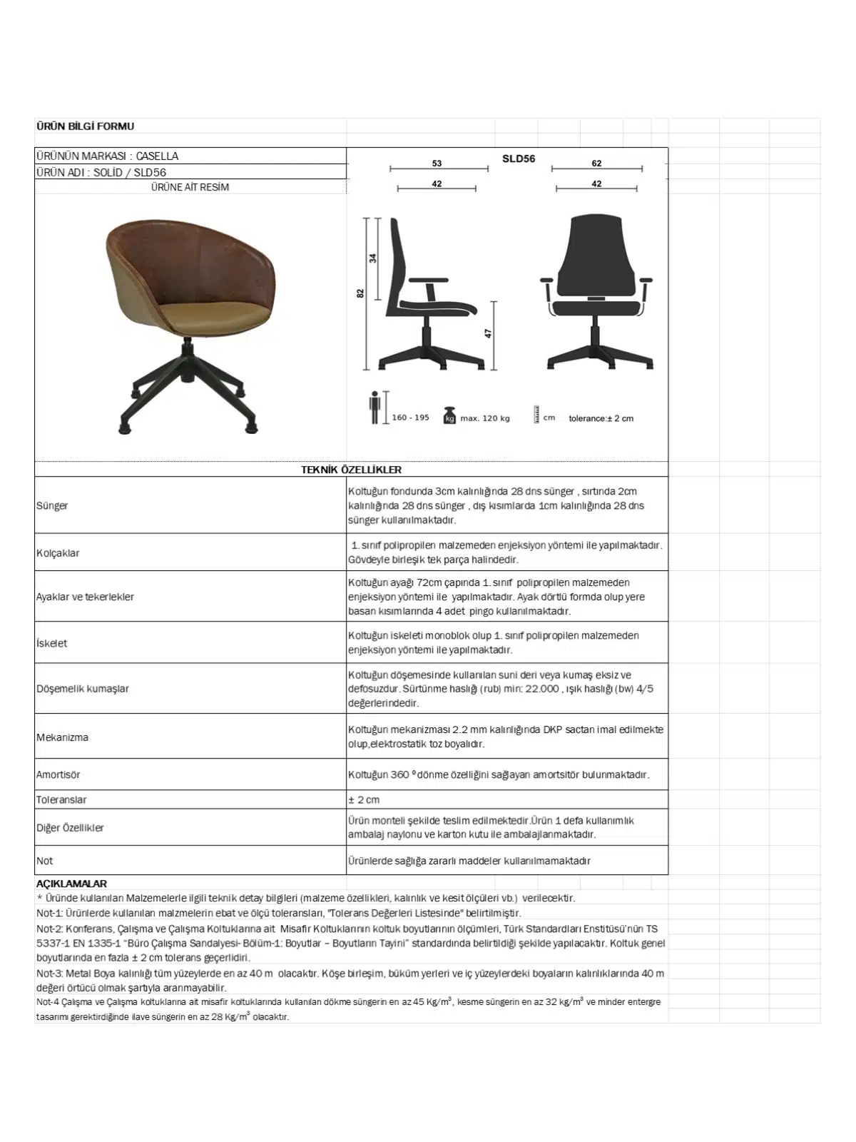 | Mekanizma | Amortisörlü yükseklik Ve sırt eğimi ayarı |