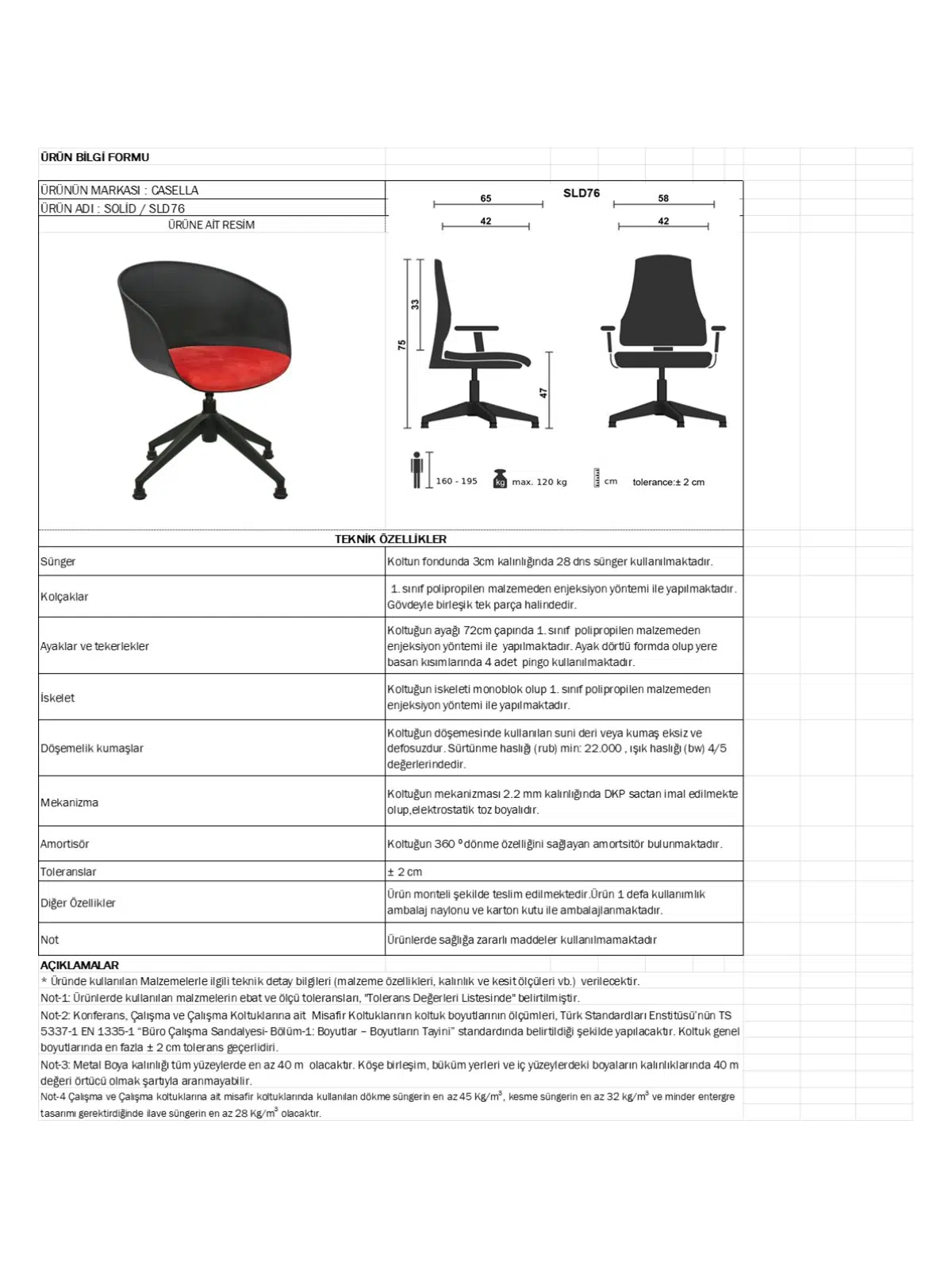 | Mekanizma | Amortisörlü yükseklik Ve sırt eğimi ayarı |