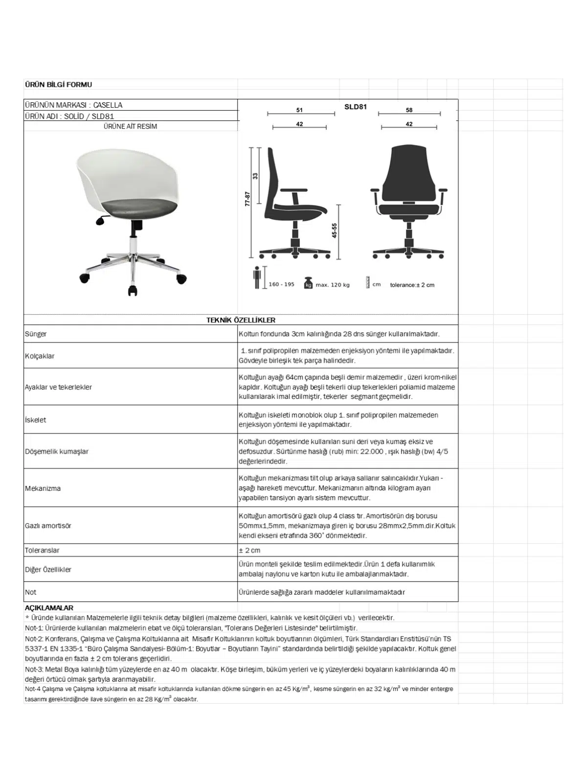 | Mekanizma | Amortisörlü yükseklik Ve sırt eğimi ayarı |