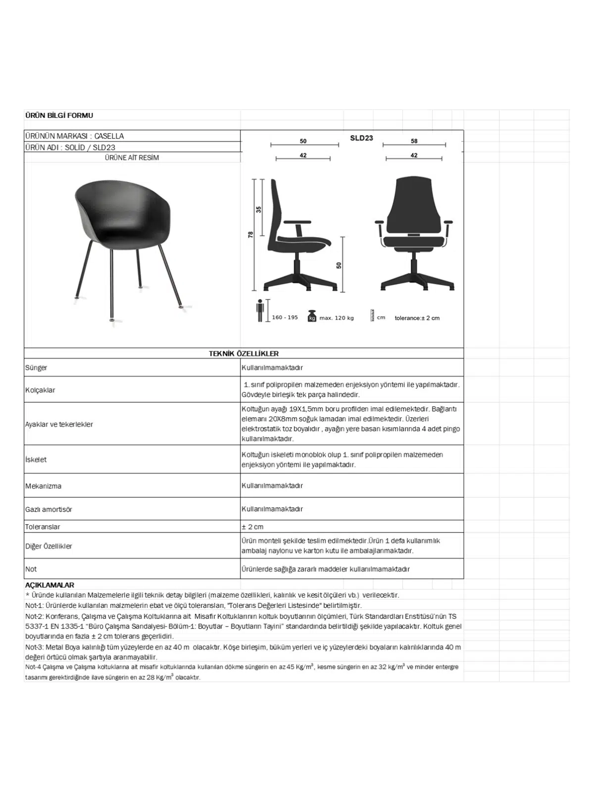 | Mekanizma | Amortisörlü yükseklik Ve sırt eğimi ayarı |